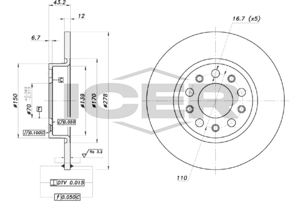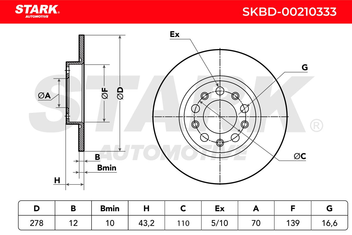 брой на дупките: 5вид на спирачния диск: плътенвисочина: 43,2mmвъншен диаметър: 278mmдебелина на спирачния диск: 12mmмин. дебелина: 10mmстрана на монтаж: задна осцентриращ диаметър: 70mm