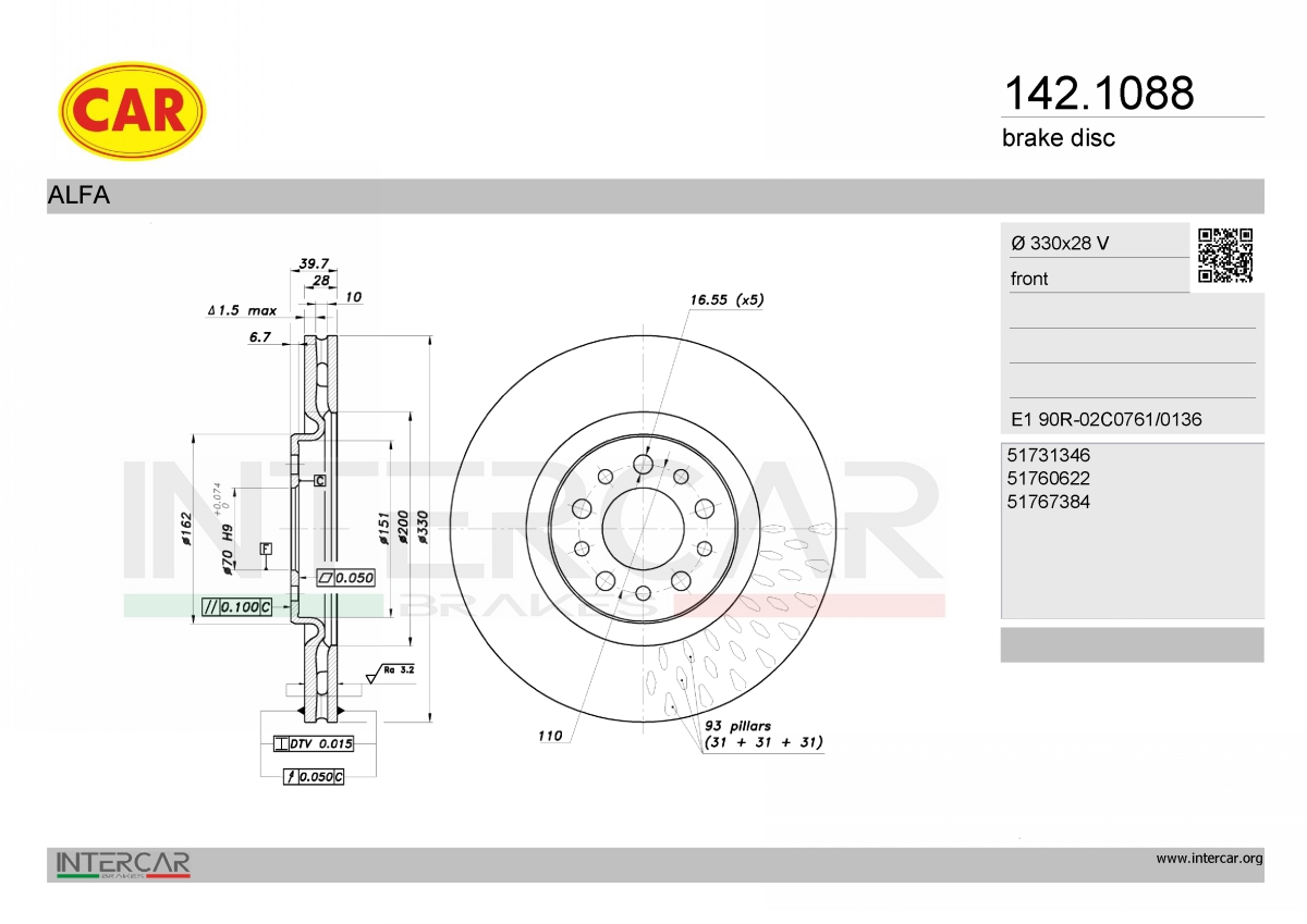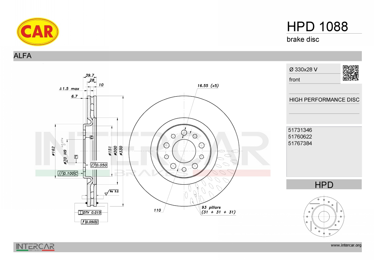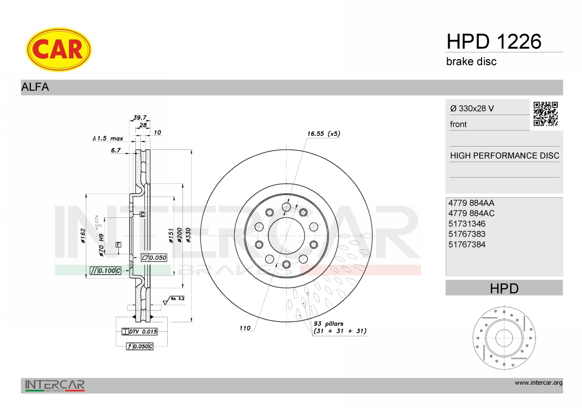 брой на дупките: 5вид на спирачния диск: вентилиранвид на спирачния диск: перфориранвисочина: 39,7mmвъншен диаметър: 330mmвътрешен диаметър: 151mmдебелина на спирачния диск: 28mmДиаметър на кръговата стъпка Ø: 110mmмин. дебелина: 26mmмярка на резбата: 16,7повърхност: галванизиранстрана на монтаж: предна остегло: 9,9kgцентриращ диаметър: 70mm