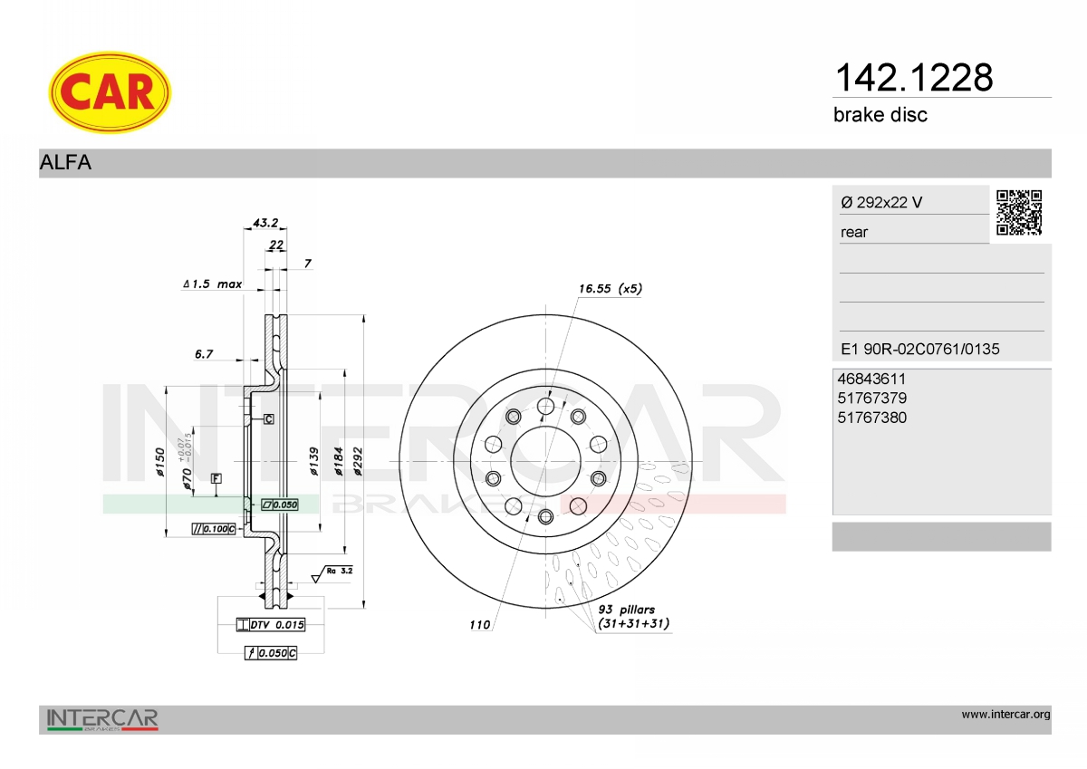 за OE-номер: 51767380за модела на серията: 939AXN1Bстрана на монтаж: задна осброй на дупките: 5вид на спирачния диск: с вътрешно вентилираневисочина: 43mmвъншен диаметър: 292mmдебелина на спирачния диск: 22mmмин. дебелина: 20mmповърхност: с покритиецентриращ диаметър: 70mm