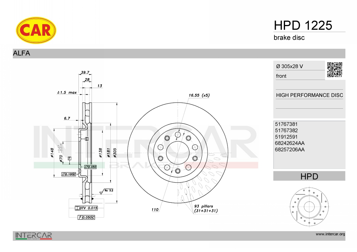 страна на монтаж: предна осходова част: 52брой на дупките: 5брой на дупките: 5вид на спирачния диск: с вътрешно вентилираневисочина: 39,7mmвъншен диаметър: 305mmдебелина на спирачния диск: 28mmДиаметър на кръговата стъпка Ø: 110mmмин. дебелина: 26mmповърхност: с покритиецентриращ диаметър: 70mm