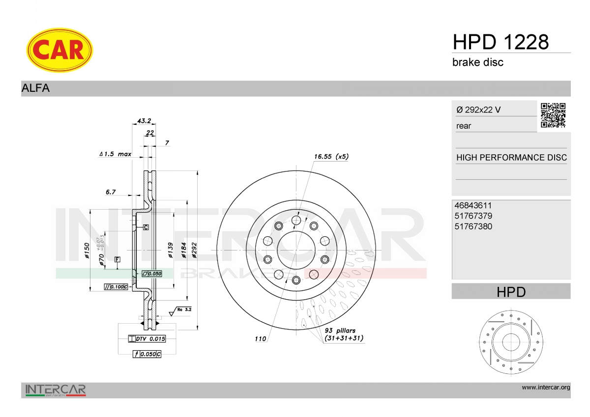 брой на дупките: 5вид на спирачния диск: вентилиранвисочина: 43,2mmвъншен диаметър: 292mmвътрешен диаметър: 139mmдебелина на спирачния диск: 22mmДиаметър на кръговата стъпка Ø: 110mmмин. дебелина: 20mmмярка на резбата: 16,7страна на монтаж: задна остегло: 6,2kgцентриращ диаметър: 70mm