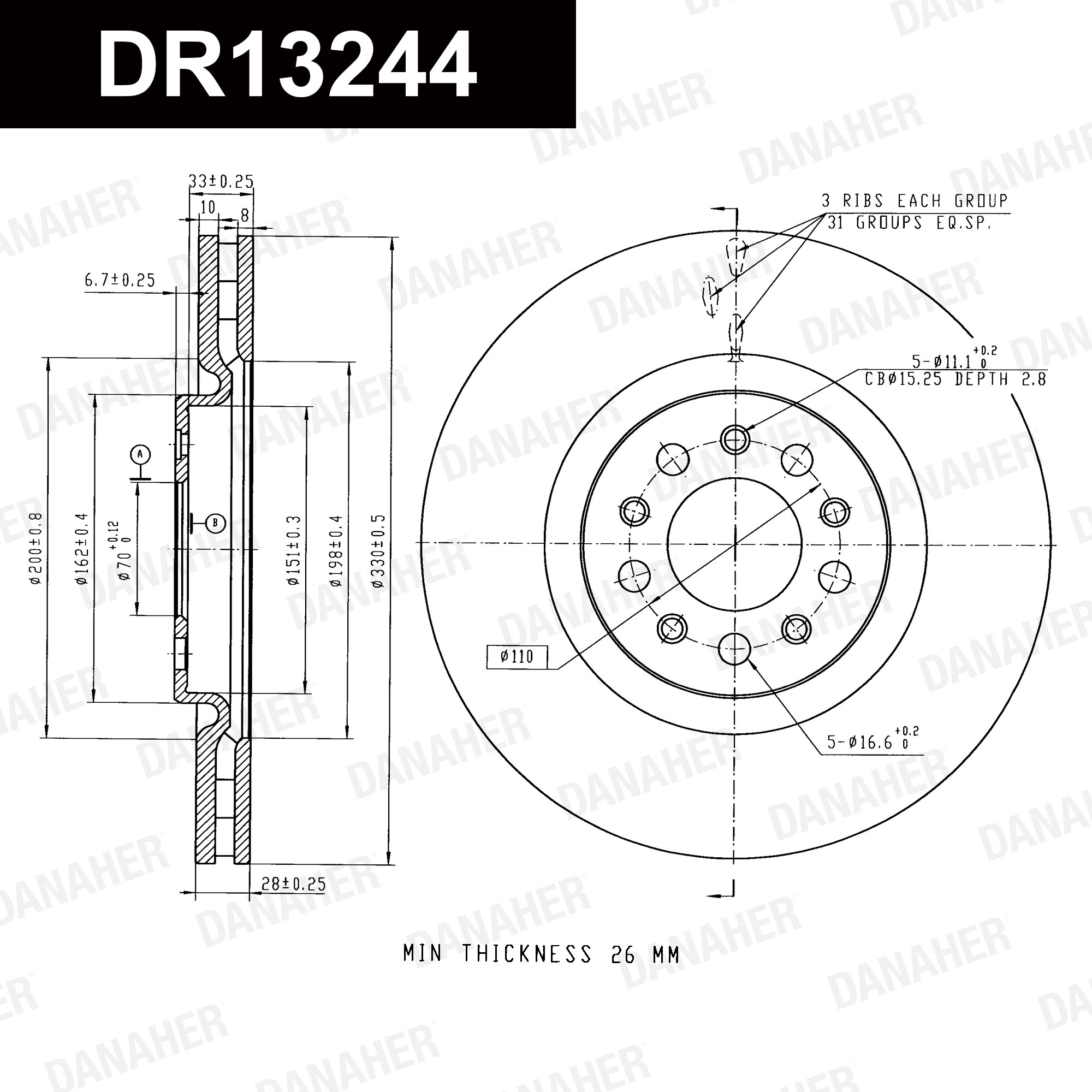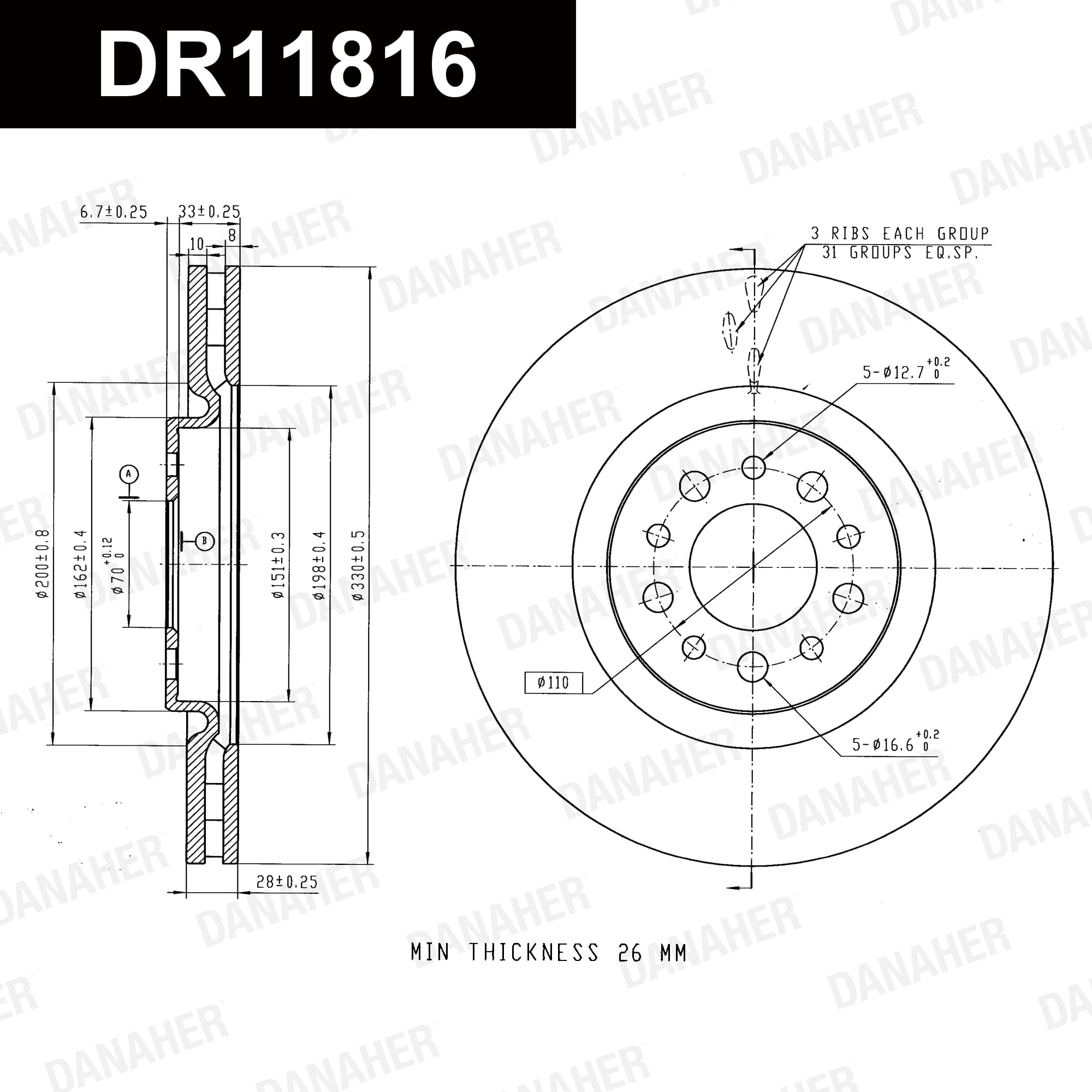 страна на монтаж: предна осджанта: 5-дупкивид на спирачния диск: вентилиранвисочина: 40mmвъншен диаметър: 330mmдебелина на спирачния диск: 28mmГлавина Ø: 162mmДиаметър на кръговата стъпка Ø: 110mmмин. дебелина: 26mmповърхност: с покритиецентриращ диаметър: 69,8mm