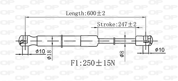 ход: 247mmдиаметър на буталния лост: 8mmдиаметър на корпуса: 18mmдиаметър на точките на закрепване: 18mmдължина: 600mmдължина на корпус: 322,5mmизтласкваща сила: 250Нютонстрана на монтаж: двустранентегло: 0,283kg