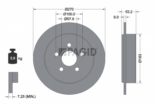 страна на монтаж: задна осджанта: 5-дупкивид на спирачния диск: плътенвисочина: 59mmвъншен диаметър: 270mmдебелина на спирачния диск: 9mmГлавина Ø: 183mmДиаметър на кръговата стъпка Ø: 100mmмин. дебелина: 7,2mmповърхност: с покритиетегло: 3,95kgцентриращ диаметър: 57mm