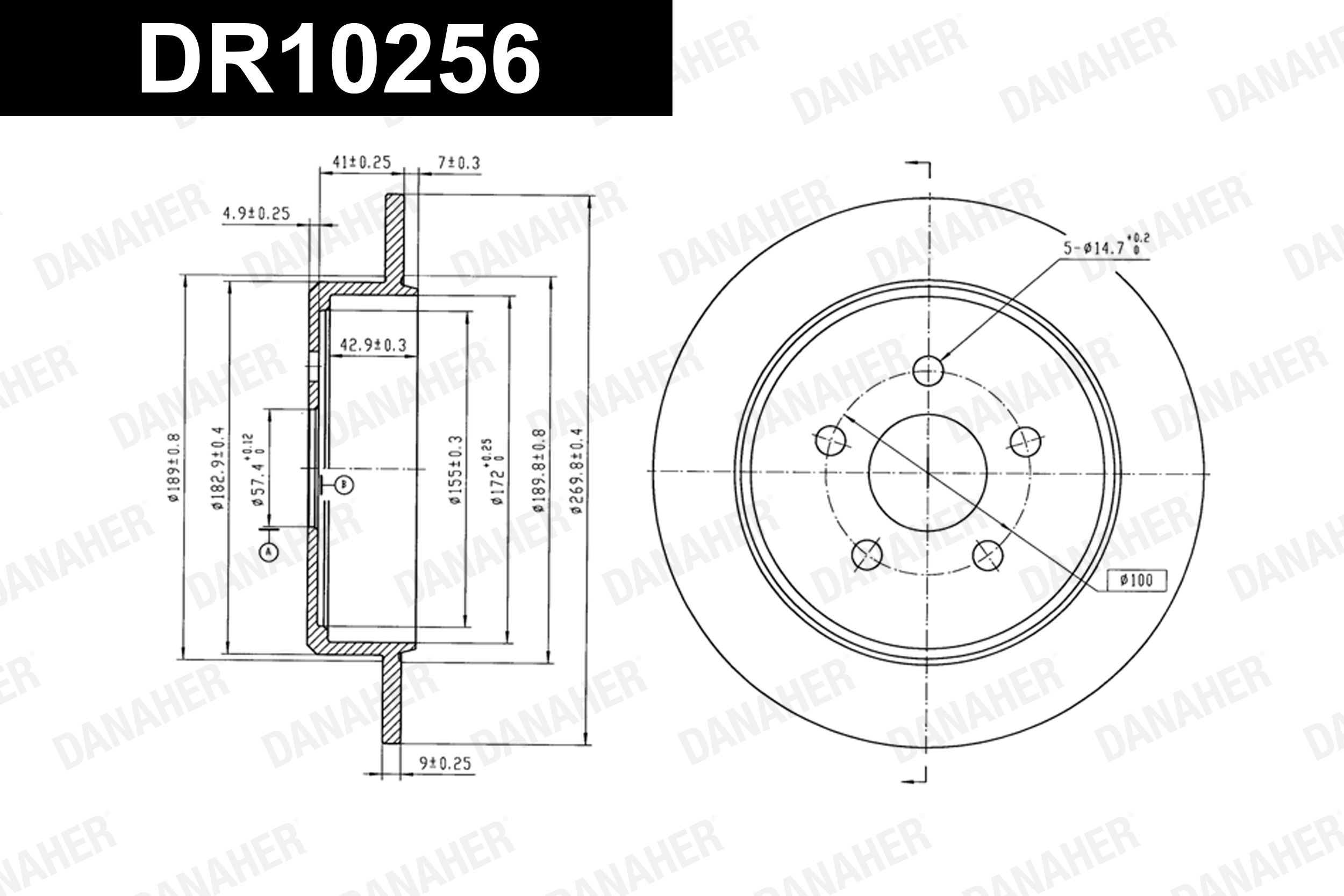 страна на монтаж: задна осброй на дупките: 5вид на спирачния диск: плътенвисочина: 52,9mmвъншен диаметър: 269,8mmдебелина на спирачния диск: 9mmОтвор Ø до: 14,7mmДиаметър на кръговата стъпка Ø: 100mmмин. дебелина: 7,3mmповърхност: омасленудовлетворява нормите на ЕИК: ECE-R90центриращ диаметър: 57,4mm