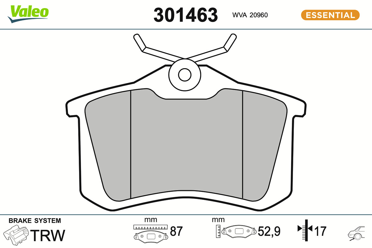 спирачна уредба: 13страна на монтаж: задна осWVA-номер: 20960WVA-номер: 20961дебелина: 17mmдължина: 87mmконтактен датчик за износване: не е за подготвен за предупредителен датчик за износванеспирачна система: TRWширина: 52,9mm