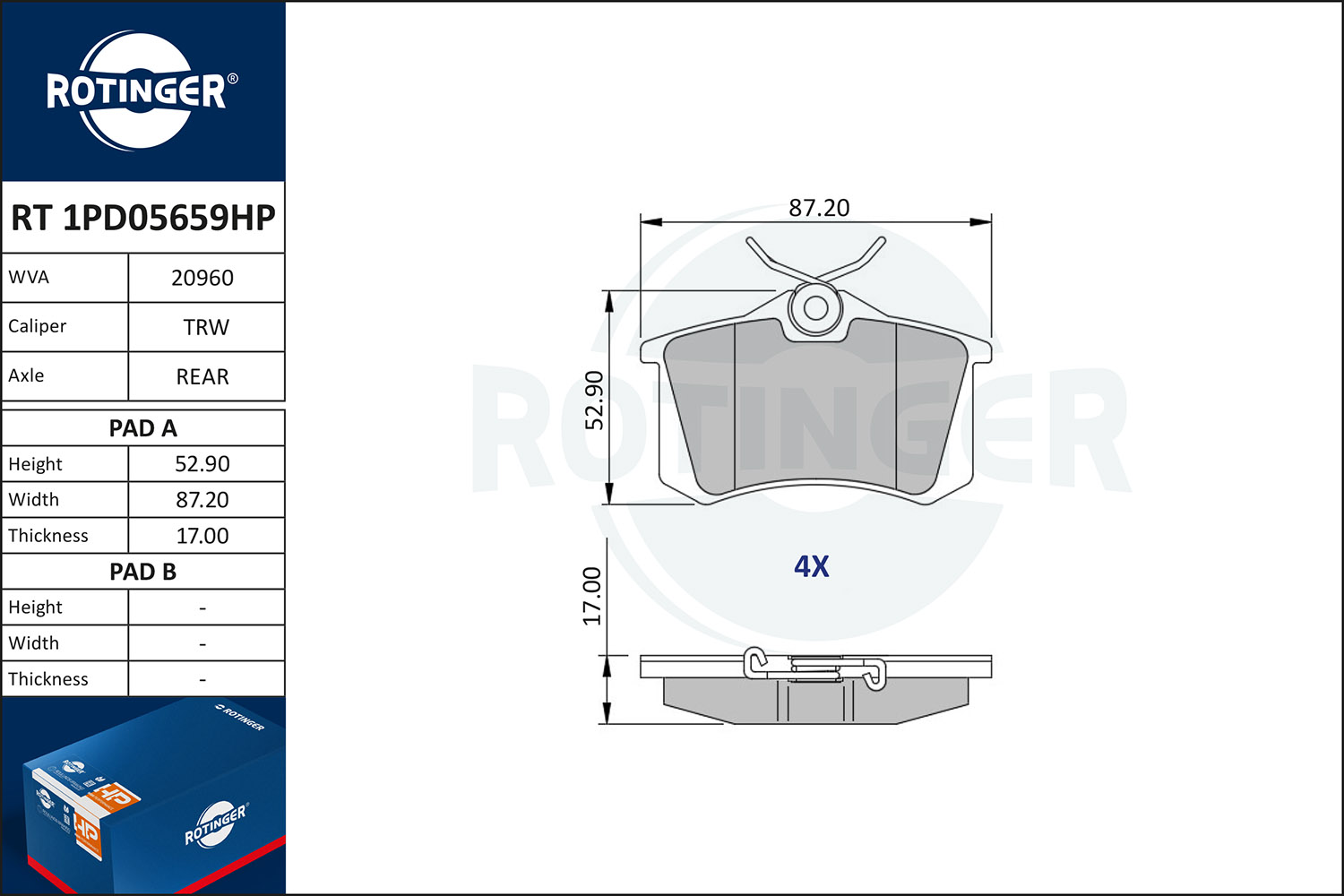 страна на монтаж: задна освисочина: 52,9mmдебелина: 16mmконтактен датчик за износване: не е за подготвен за предупредителен датчик за износванеконтролен знак за преглед: E9 90R- 01120/457ограничение за производител: TRWширина: 87mm