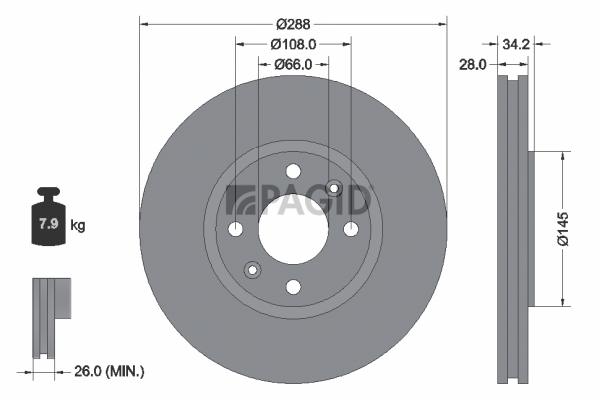 страна на монтаж: предна осброй на дупките: 4вид на спирачния диск: вентилиранвисочина: 34,2mmвъншен диаметър: 288mmдебелина на спирачния диск: 28mmДиаметър на кръговата стъпка Ø: 108mmмин. дебелина: 26mmцентриращ диаметър: 66mm