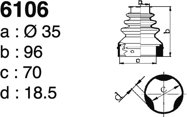 вид на шарнира: триподно каревисочина: 96mmвъншен диаметър: 70mmвътрешен диаметър: 35mmза OE-номер: 3287A9материал: гумастрана на монтаж: от страната на колелотострана на монтаж: от страната на трансмисията