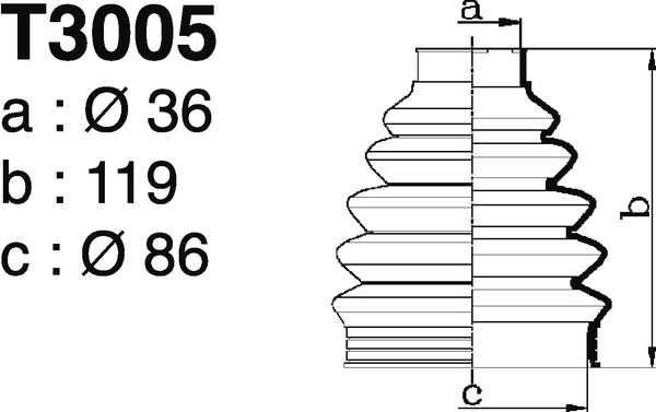 страна на монтаж: на предната ос отдяснострана на монтаж: на предната ос отлявострана на монтаж: от страната на трансмисиятавид на шарнира: триподно каревътрешен диаметър 1: 35mmвътрешен диаметър 2: 69mmдължина: 95mmматериал: NBR (Нитрил-Бутадиен-Каучук)