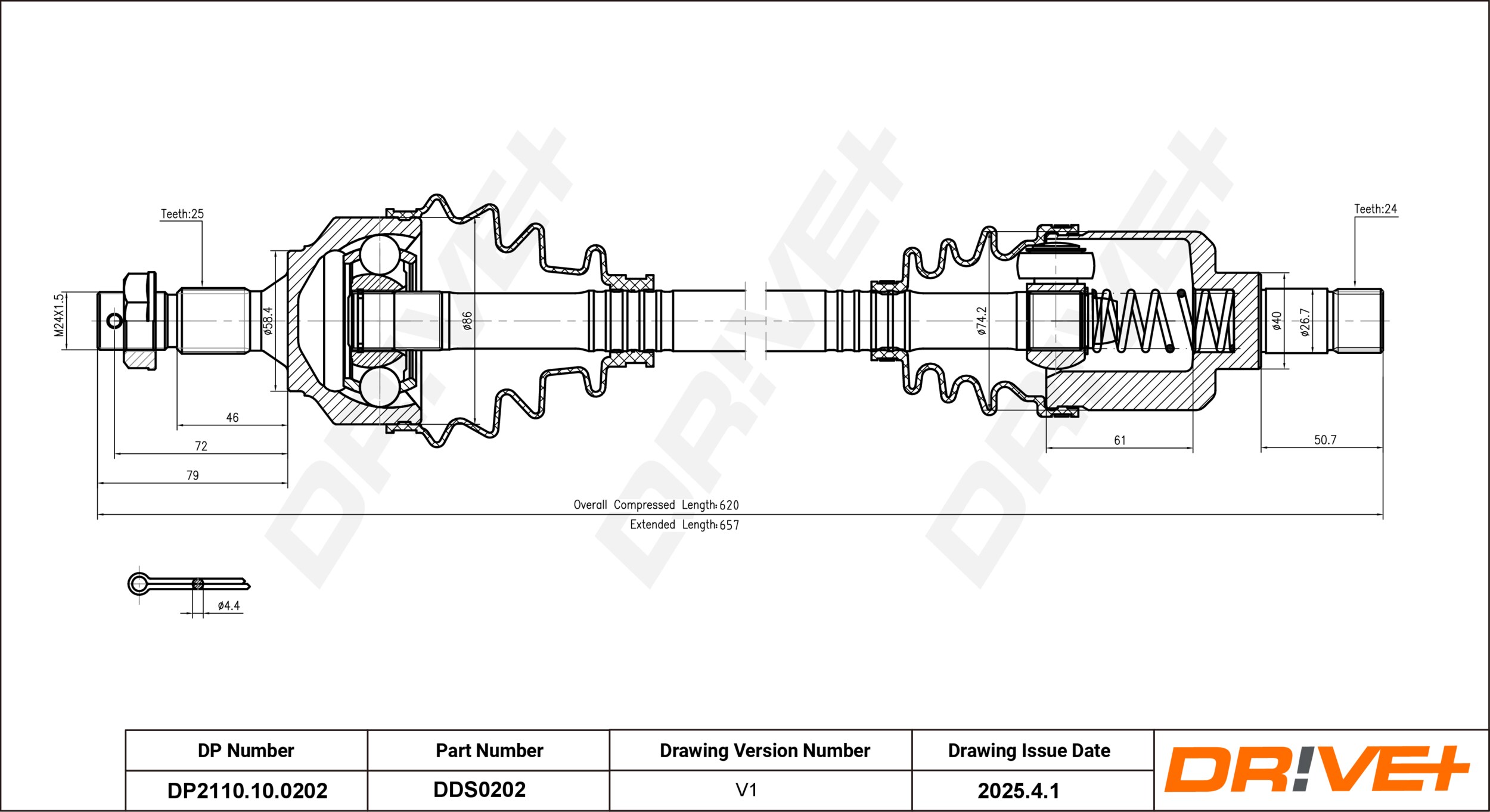 страна на монтаж: на предната ос отлявовид на шарнира: триподно каревъншни зъби от страна на колелото: 25външни зъби откъм диференциал: 24диам. на гарн.: 58,4mmдиаметър на шарнира от страна на колелото: 86mmдиаметър на шарнира от страна на скоростната кутия: 74,2mmдължина 1: 620mmдължина 2: 657mm