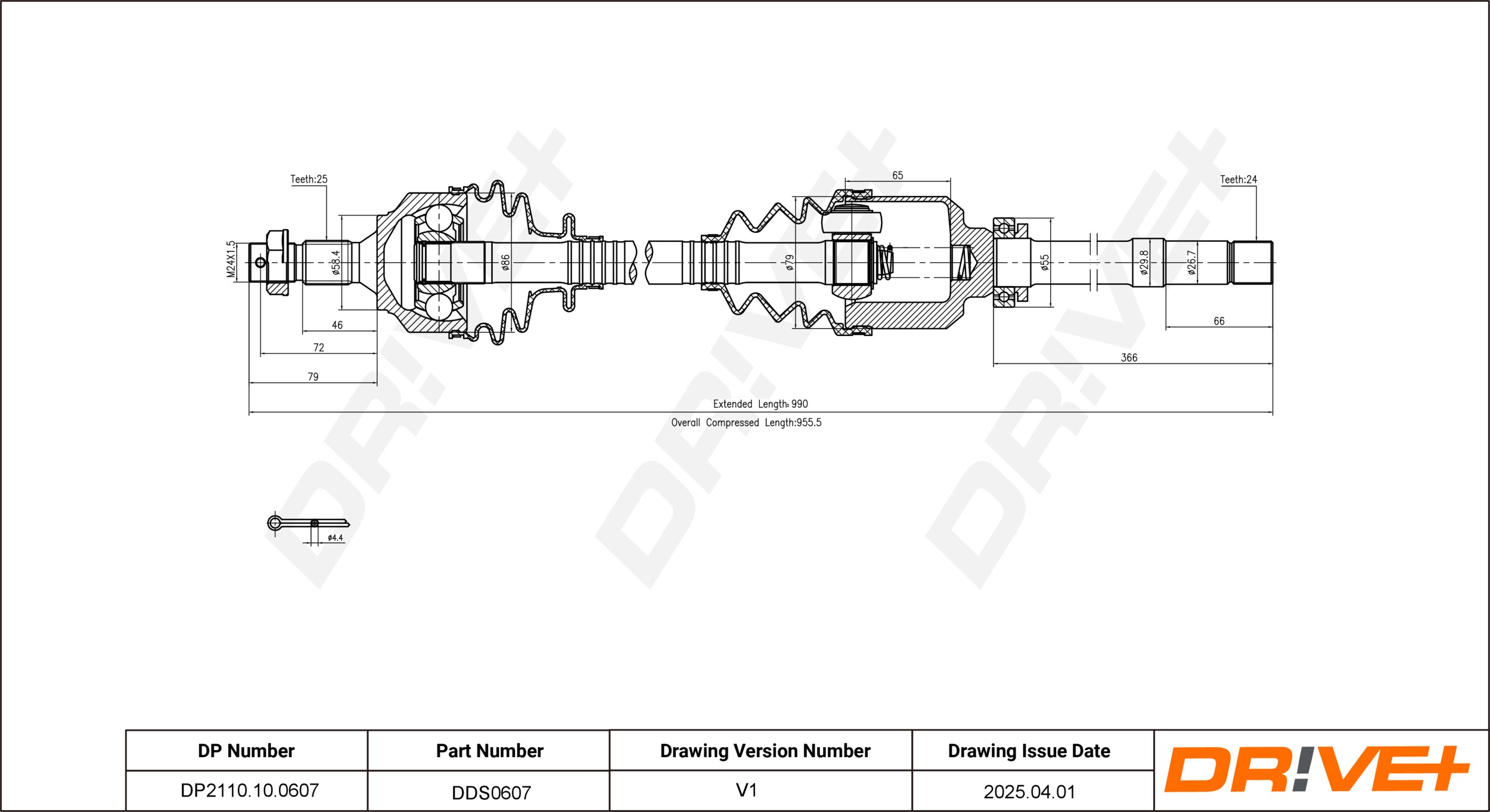 страна на монтаж: на предната ос отдясновид на шарнира: триподно каревъншни зъби от страна на колелото: 25външни зъби откъм диференциал: 24диам. на гарн.: 58,4mmдиаметър на шарнира от страна на колелото: 86mmдиаметър на шарнира от страна на скоростната кутия: 79mmдължина 1: 956mmдължина 2: 990mm