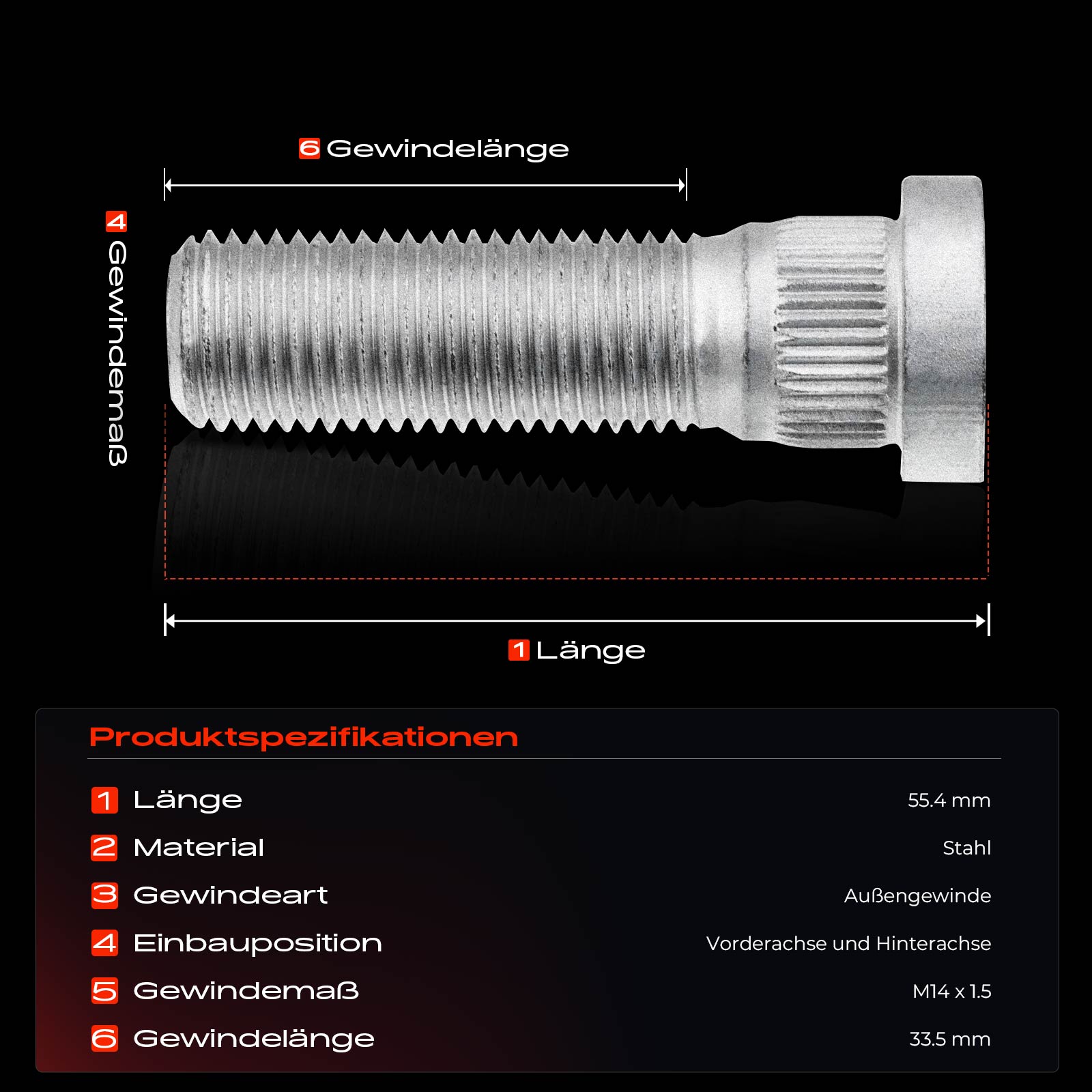 дължина: 55mmдължина на резбата: 34mmматериал: стоманамярка на резбата: M14 x 1.5страна на монтаж: отпред и отзад
