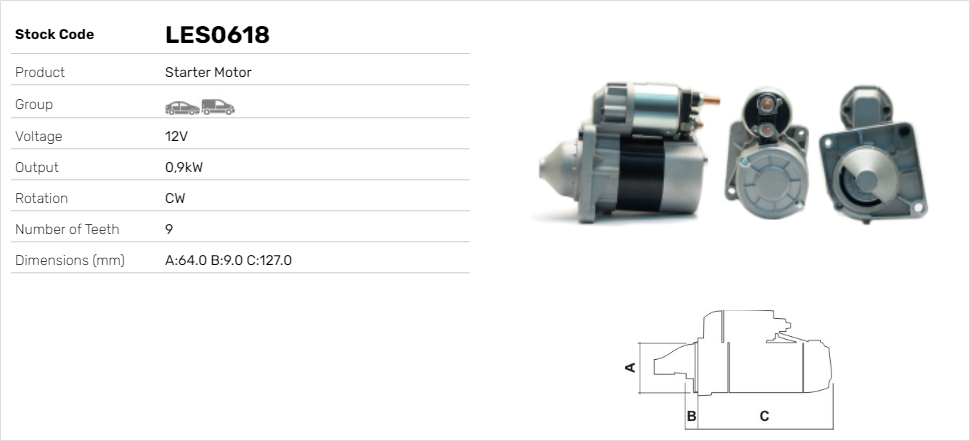 брой на зъбите: 9напрежение: 12волтстартова мощност: 1,1киловатпосока на въртене: въртене по посока на часовниковата стрелка