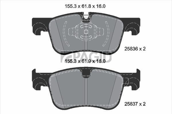 за спирачни дискове с диаметър [mm]: 283ограничение за производител: Ateвисочина 1: 61,8mmвисочина 2: 61,9mmдебелина: 16mmконтактен датчик за износване: подготвен за предупредителен датчик за износванеспирачна система: Tevesстрана на монтаж: предна осширина: 155,3mm