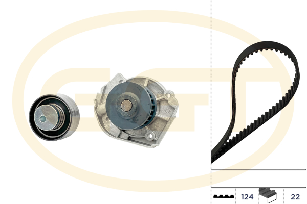 брой на зъбите: 124Брой ремъци: 1допълващ артикул /допълваща информация: без уплътнениедопълващ артикул /допълваща информация: с водна помпаналичната ролка: 1ширина: 22mm