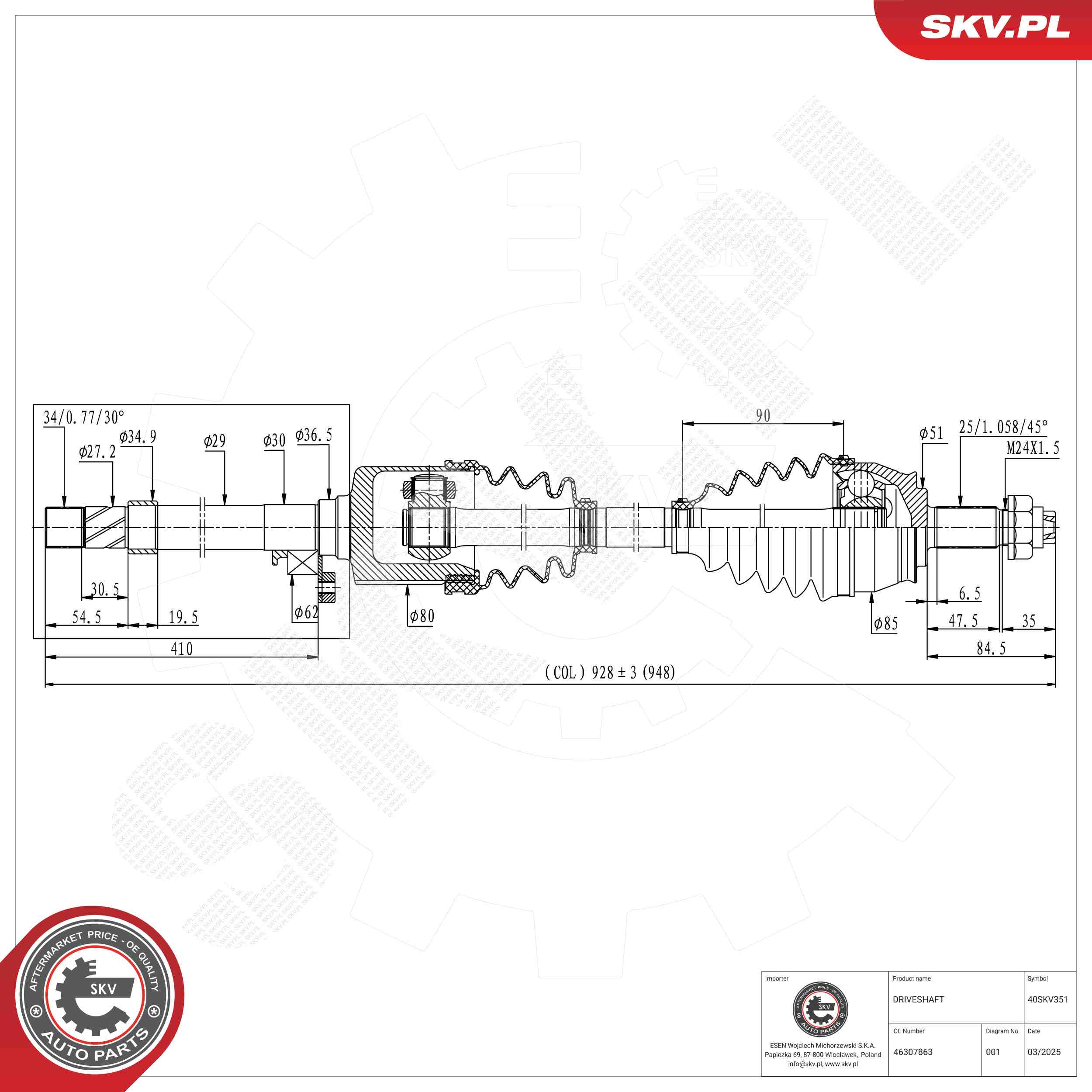 външни зъби от страна на колелото: 25външни зъби откъм диференциал: 34дължина: 927mmстрана на монтаж: на предната ос отдясно