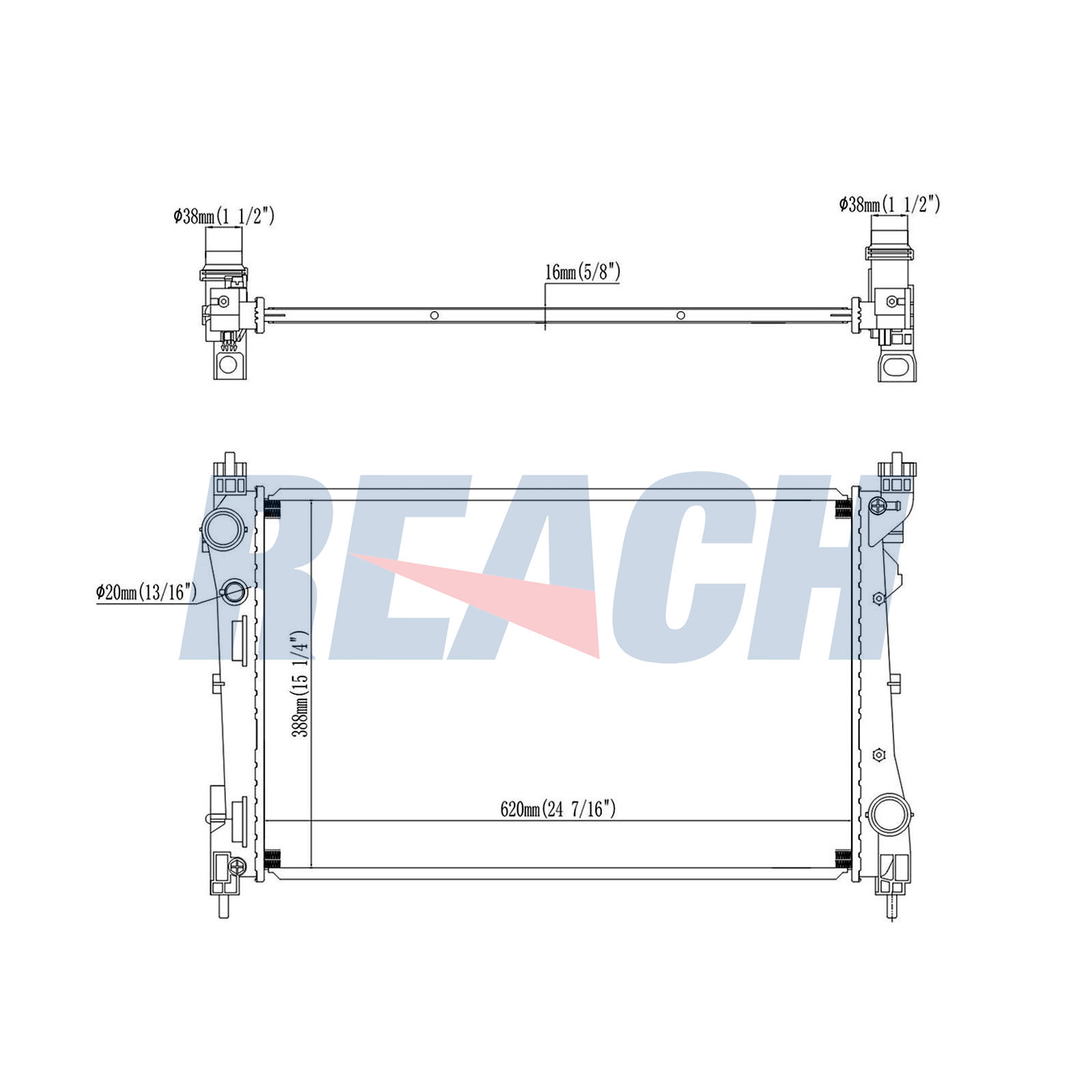Входящ отвор Ø: 38mmдоп. артикул/доп. инфо. 2: без разширителен съддълбочина на мрежа: 22mmдължина на мрежа: 620mmизпълнение на охладител: запоени охлацдащи ламелиИзходящ отвор Ø: 38,5mmматериал на ламелите на радиатора: алуминийматериал на резервоар (охладител): пластмасаширина на мрежа: 398mm
