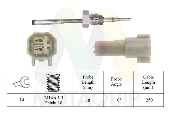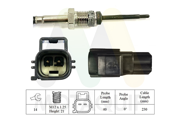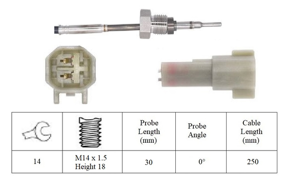 брой на щепселните контакти: 2-щифтенвид на горивото: дизелвид на датчика: PTC-датчик (положителен температурен коефициент)дължина: 342mmдължина на кабела: 118mmкачество: Originalмярка на резбата: M14x1.5 mmот температура: -40°Cразмер на ключ: 17страна на монтаж: след филтъра за саждитемп. диапазон до: 950°Cцвят на щекер: черен