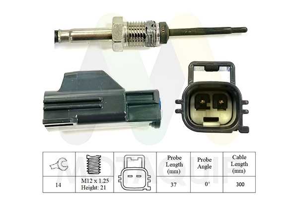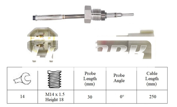 брой на щепселните контакти: 2-щифтенвид на горивото: дизелвид на датчика: PTC-датчик (положителен температурен коефициент)дължина: 757mmдължина на кабела: 118mmкачество: Originalмярка на резбата: M14x1.5 mmот температура: -40°Cразмер на ключ: 17страна на монтаж: след филтъра за саждитемп. диапазон до: 950°Cцвят на щекер: черен