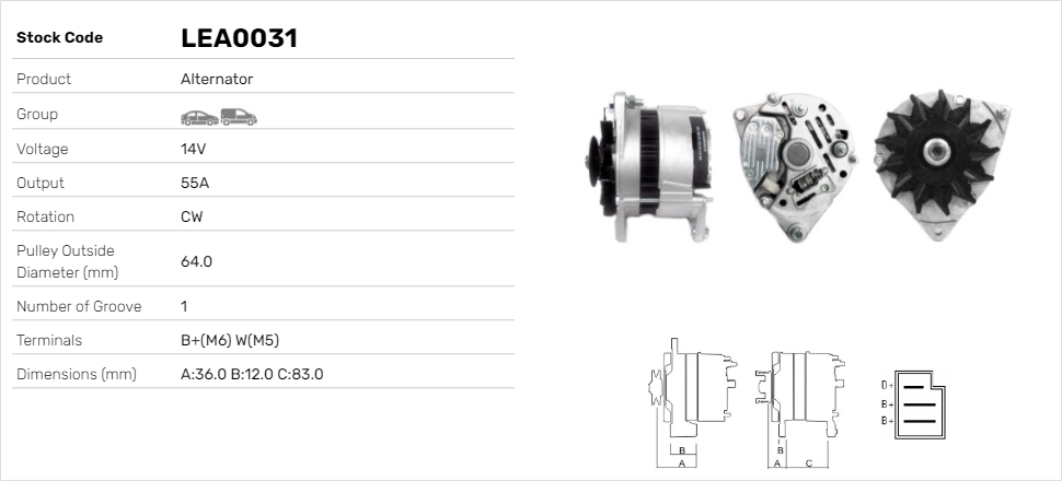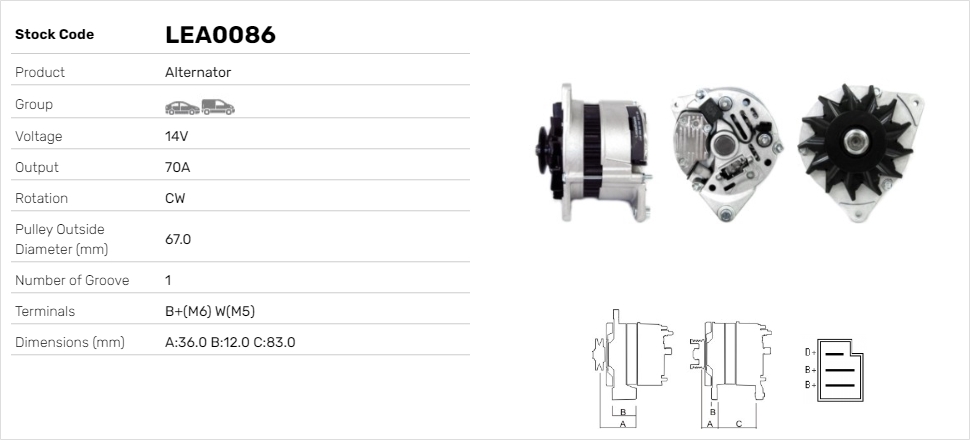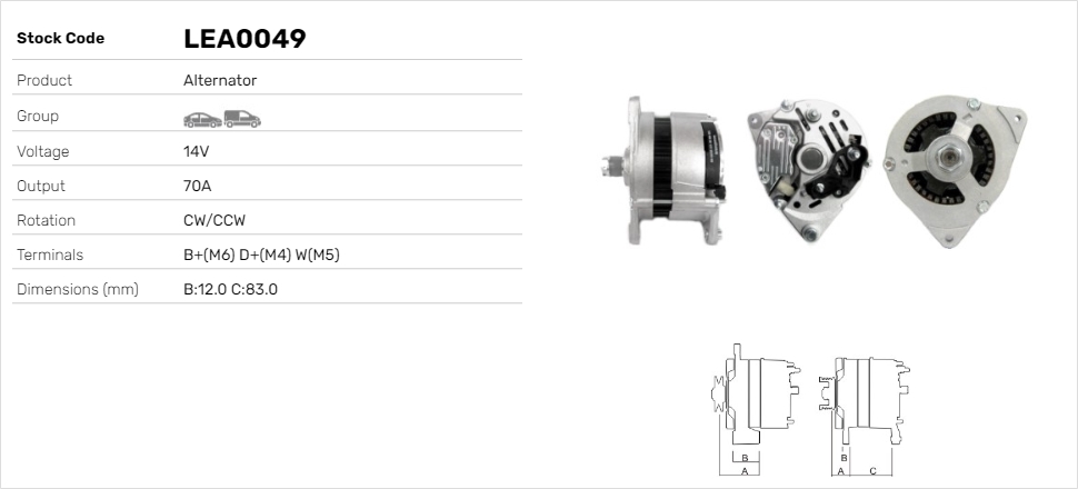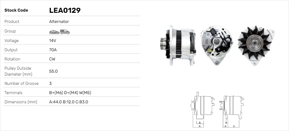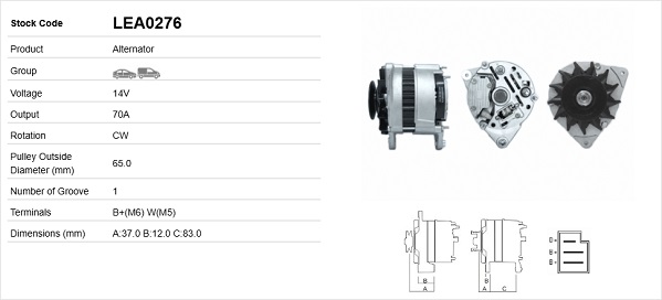 брой на ребрата: 3дебелина 1: 12,0mmДължина 4: 83,0mmнапрежение: 14волтзаряден ток на генератор: 70Аклема: B+(M6) D+(M4) W(M5)посока на въртене: въртене по посока на часовниковата стрелкаДистанция от ремъчната шайба до генератора: 44,0mmРемъчна шайба Ø: 55mmспецификация: A127