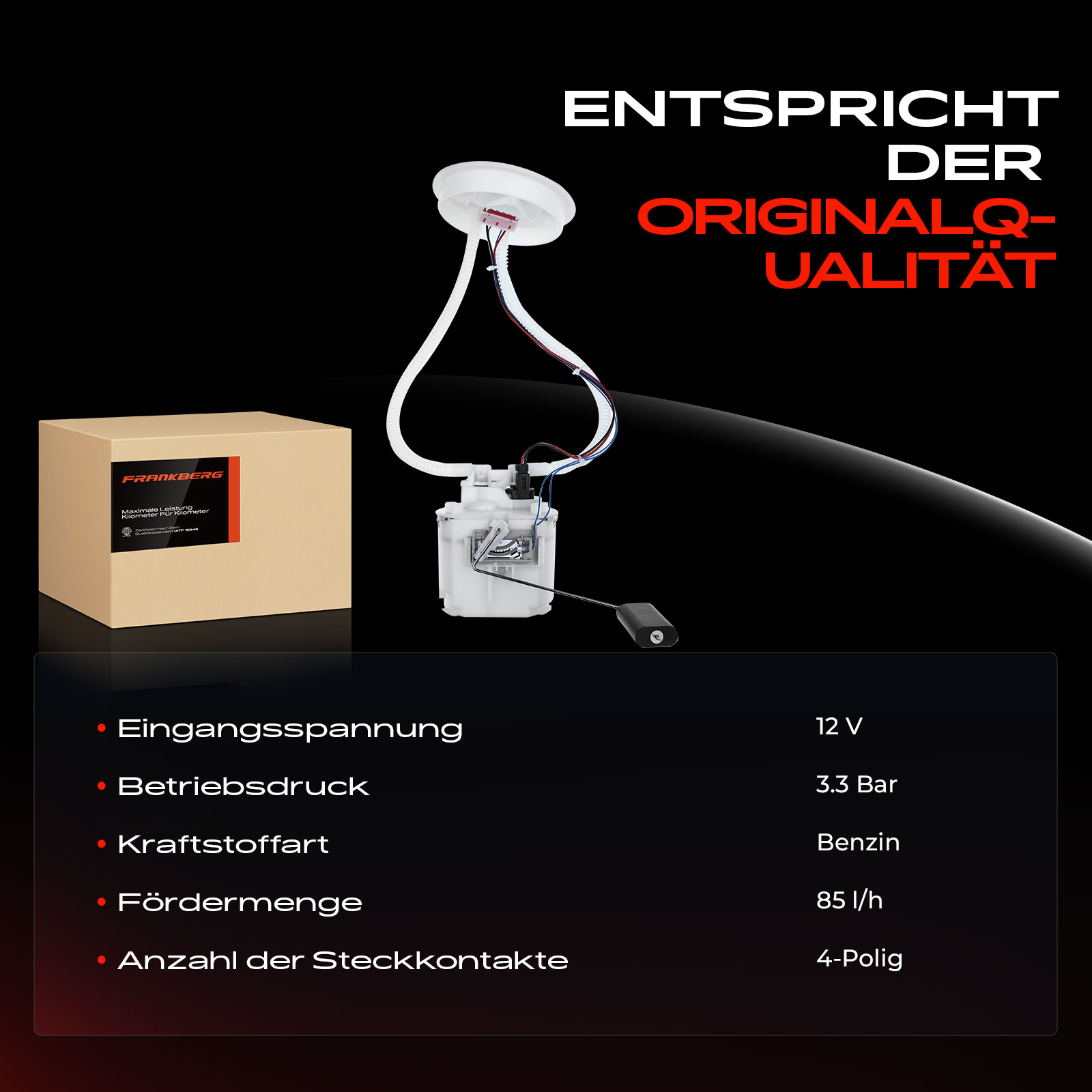 брой на щепселните контакти: 4-щифтенвид на горивото: бензинвид на експлоатация: електрическидебит: 85литра/часдоп. артикул/доп. инфо. 2: без филтърдопълващ артикул /допълваща информация: без уплътнениенапрежение: 12волтработно налягане: 3,3барширина: 120,5mm