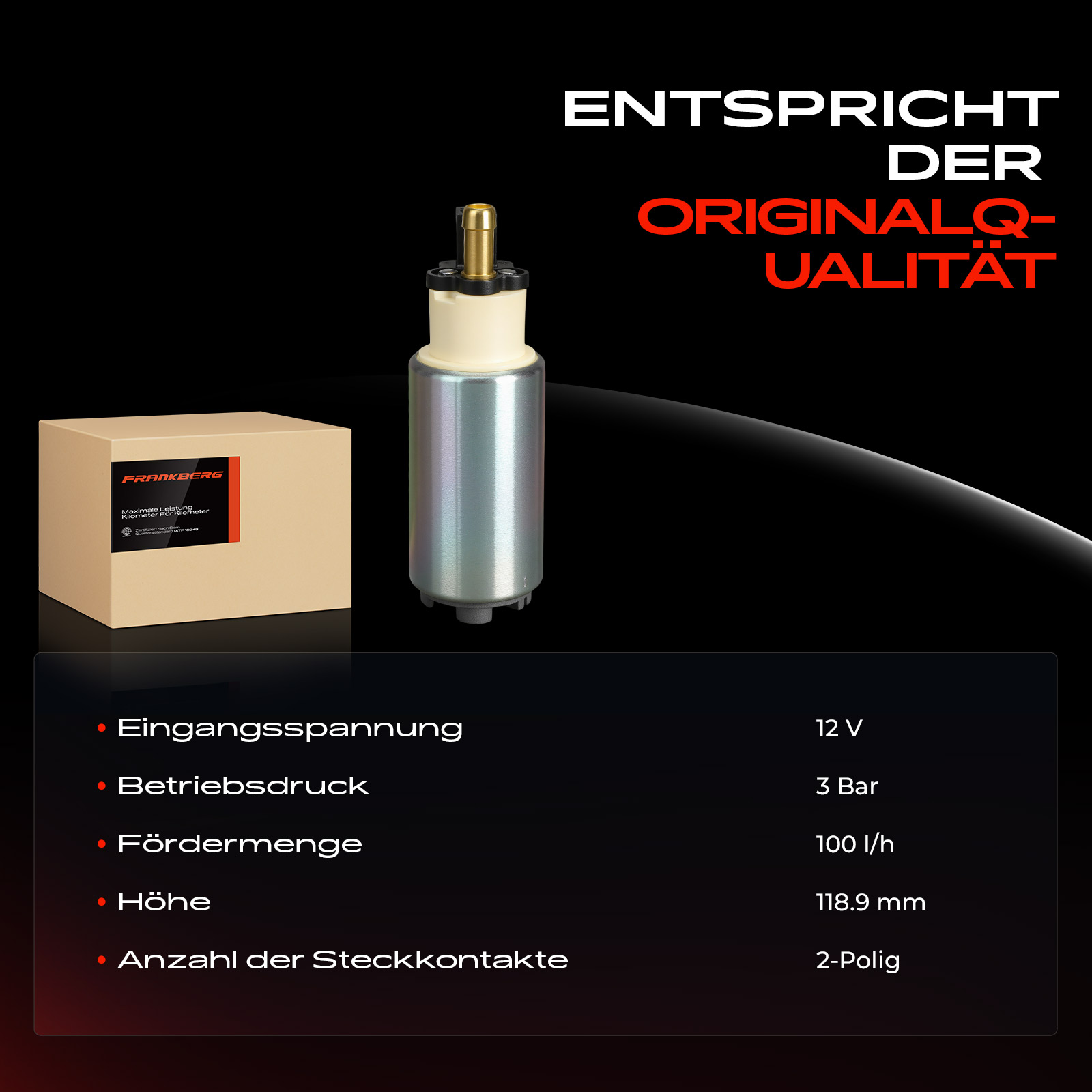 брой на щепселните контакти: 4-щифтенвид на горивото: бензинвид на експлоатация: електрическивисочина: 345mmдебит: 120литра/часдоп. артикул/доп. инфо. 2: без филтърдопълващ артикул /допълваща информация: без уплътнениенапрежение: 12волтработно налягане: 3барширина: 121mm
