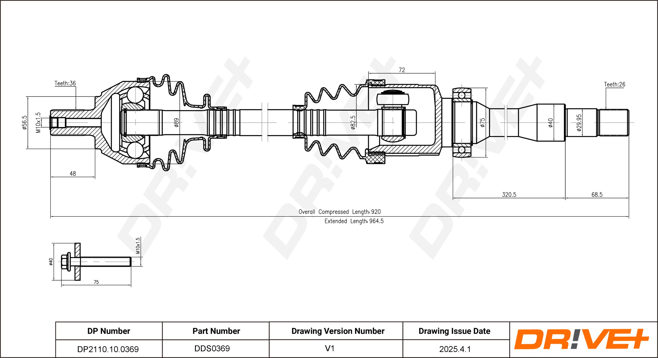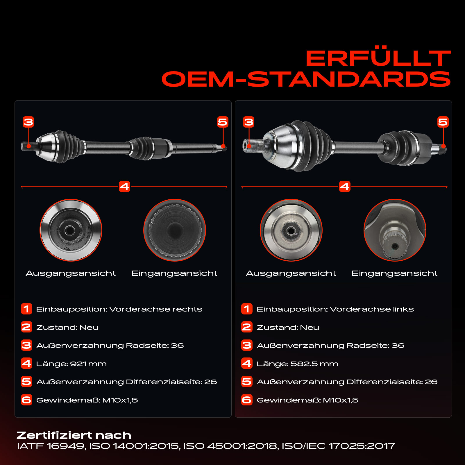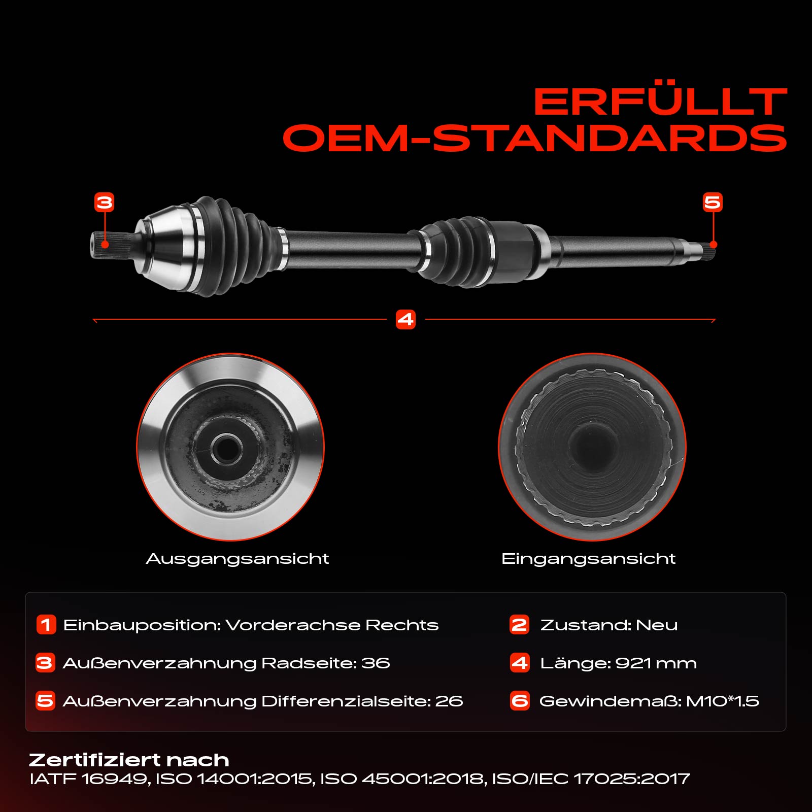 външни зъби от страна на колелото: 36външни зъби откъм диференциал: 26диаметър на шарнира от страна на скоростната кутия: 87mmдължина: 919mmдължина 1: 920mmмярка на резбата: M10x1,5страна на монтаж: на предната ос отдясно