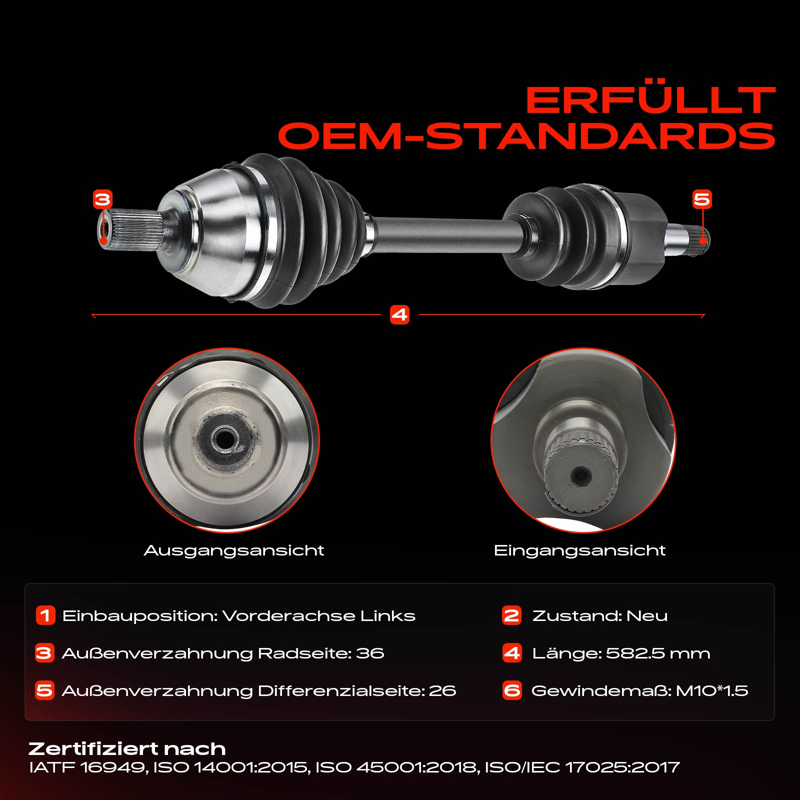 външни зъби от страна на колелото: 36външни зъби откъм диференциал: 26диаметър на шарнира от страна на колелото: 87mmдиаметър на шарнира от страна на скоростната кутия: 82mmдължина: 580mmспирачна/динамика на движение: за автомобили с ABSстрана на монтаж: на предната ос отляво