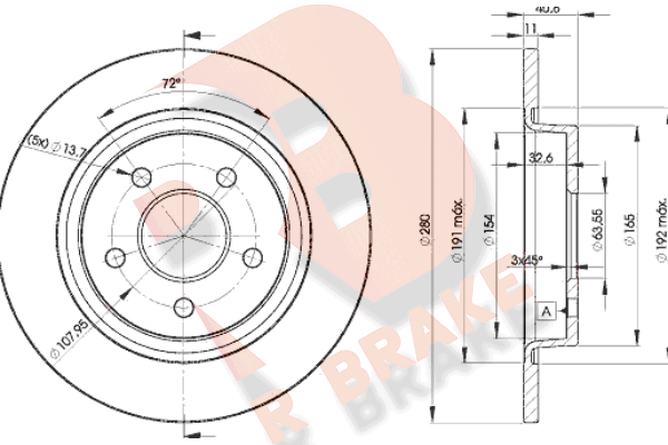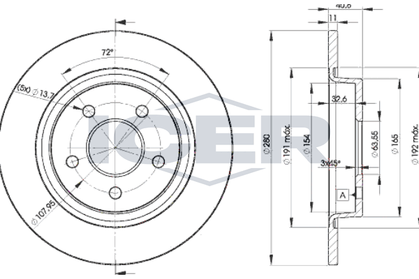 година на производство до: 201102година на производство от: 200501за размер на джантите [цол]: 17брой на дупките: 5вид на спирачния диск: плътенвисочина: 41mmвъншен диаметър: 280mmвътрешен диаметър: 192mmдебелина на спирачния диск: 11,0mmОтвор Ø: 13,7mmДиаметър на кръговата стъпка Ø: 108mmмин. дебелина: 9mmстрана на монтаж: задна осцентриращ диаметър: 63,5mm