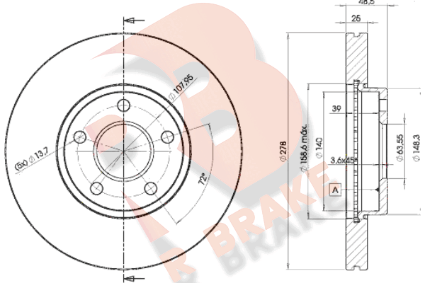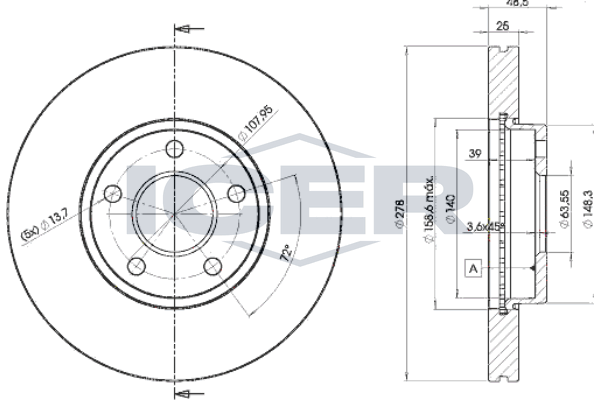брой на дупките: 5вид на спирачния диск: вентилиранвисочина: 48,5mmвъншен диаметър: 278mmвътрешен диаметър: 140mmдебелина на спирачния диск: 25mmДиаметър на кръговата стъпка Ø: 13,7mmмин. дебелина: 23mmстрана на монтаж: предна ос
