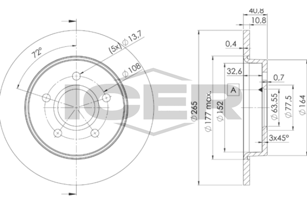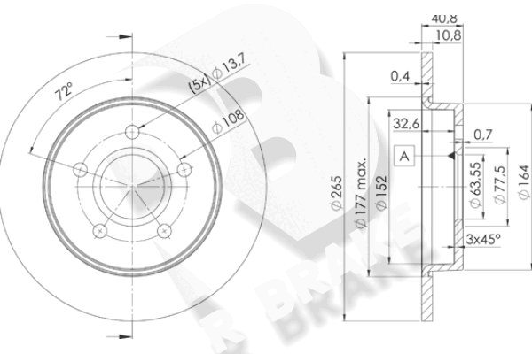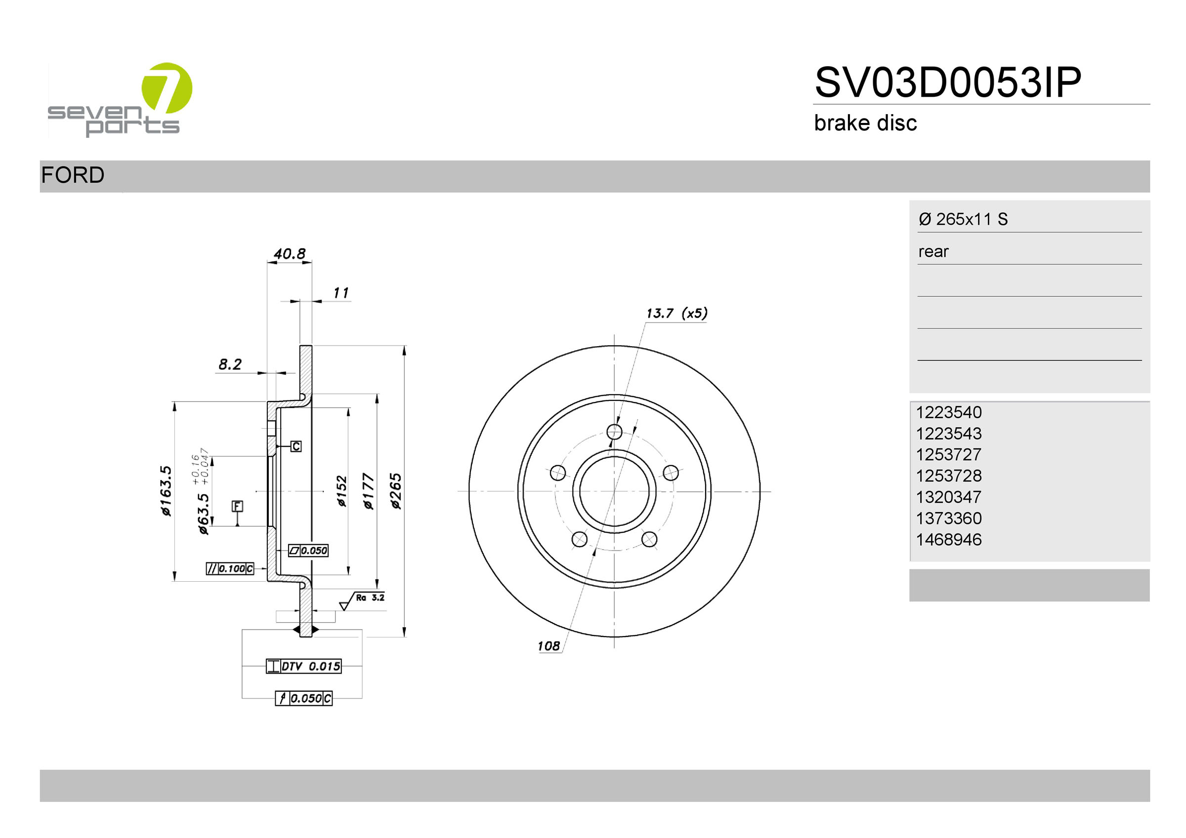 брой на дупките: 5вид на спирачния диск: плътенвисочина: 40,7mmвъншен диаметър: 265mmдебелина на спирачния диск: 10,9mmДиаметър на кръговата стъпка Ø: 108mmмин. дебелина: 10mmмярка на резбата: 13,75страна на монтаж: задна осцентриращ диаметър: 63,5mm