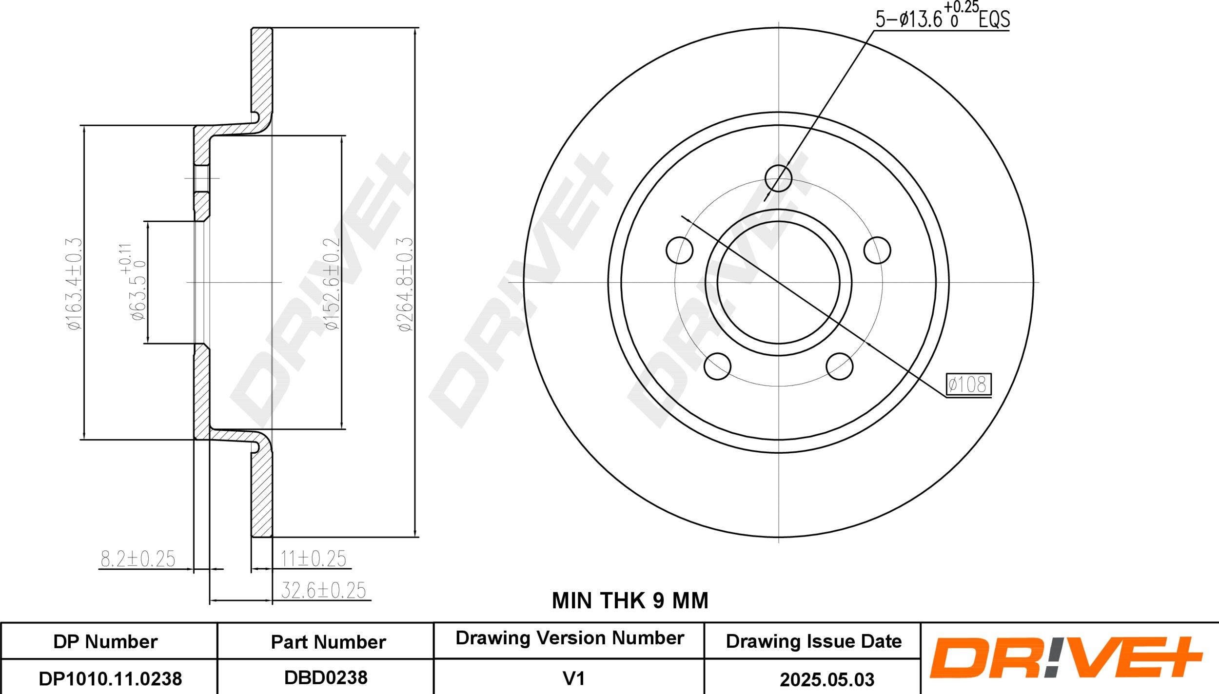 страна на монтаж: задна осджанта: 5-дупкивид на спирачния диск: плътенвисочина: 41mmвъншен диаметър: 265mmдебелина на спирачния диск: 11mmГлавина Ø: 163mmДиаметър на кръговата стъпка Ø: 108mmмин. дебелина: 9mmповърхност: с покритиецентриращ диаметър: 63,5mm
