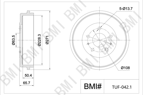 брой на дупките: 5брой/разположение на дупките: 5/7Височина спирачен барабан общо: 65,7mmВисочина спирачен барабан отвътре: 50,4mmОтвор Ø: 63,5mmдиаметър на спирачния барабан отвън: 271mmдиаметър на спирачния барабан отвътре: 228,3mmмакс. размер на разпробиване на спирачния барабан: 230,2mmповърхност: боядисанстрана на монтаж: задна осцентриращ диаметър: 63,5mm