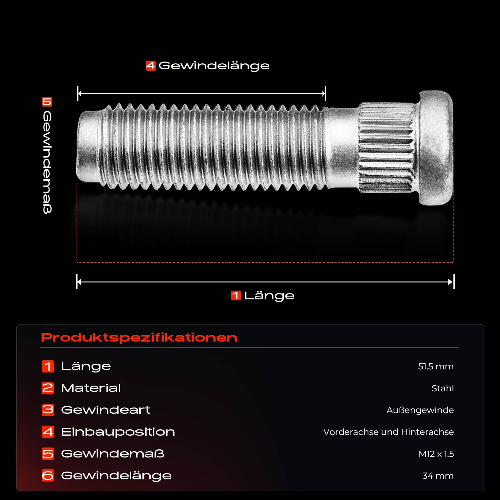 дължина: 52mmдължина на резбата: 34mmматериал: стоманамярка на резбата: M12 x 1.5страна на монтаж: отпред и отзад
