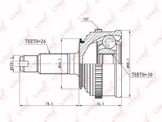 код на двигателя: D15Z6страна на монтаж: на предната ос отдяснострана на монтаж: на предната ос отлявострана на монтаж: от страната на колелототип на трансмисията: 6тип на трансмисията: 9брой на зъбите на ABS-пръстен: 50външни зъби от страна на колелото: 26вътрешни зъби от страната на колелото: 28диам. на гарн.: 55mmдължина: 130,5mmмярка на резбата: M22X1,5