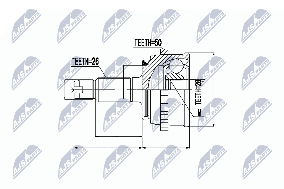 брой на зъбите на ABS-пръстен: 50вид на шарнира: сферично каре (за предаване на постоянно движение)външен диаметър: 91mmвъншни зъби от страна на колелото: 26вътрешни зъби от страната на колелото: 28диам. на гарн.: 55mmдължина: 131mmстрана на монтаж: от страната на колелото