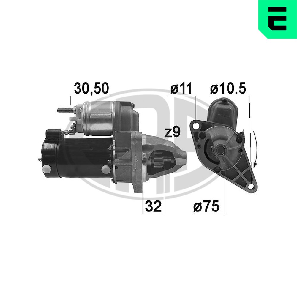 брой на дупките за закрепване: 2брой на зъбите: 9вид стартер: с понижаваща предавкаФланец Ø: 75mmнапрежение: 12волтстартова мощност: 1киловатводещо зъбно колело - основна позиция: 32,00mmпосока на въртене: въртене по посока на часовниковата стрелка