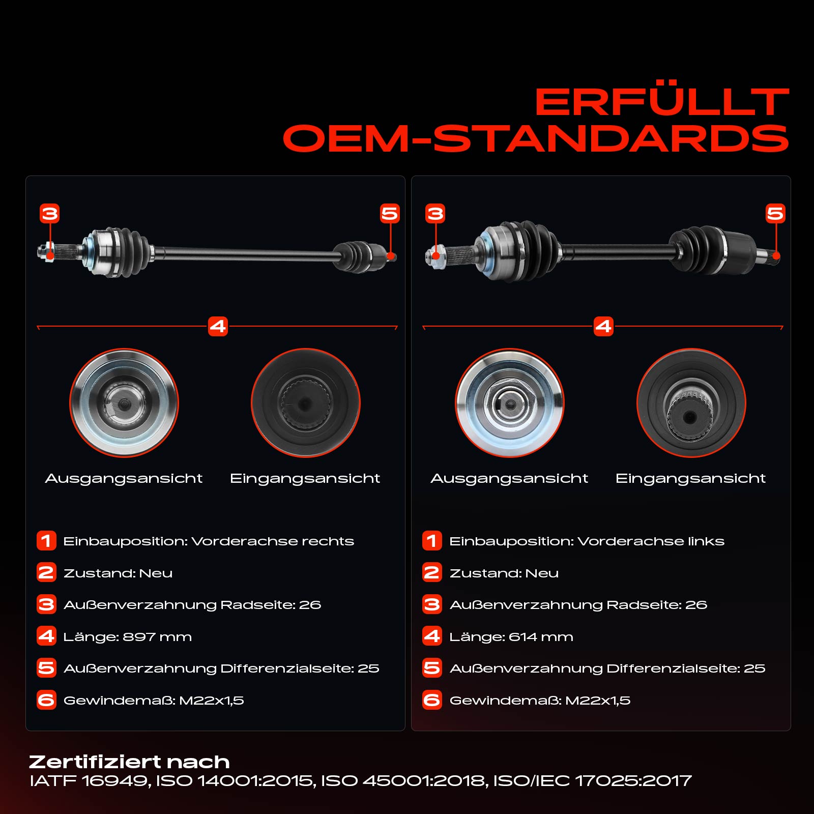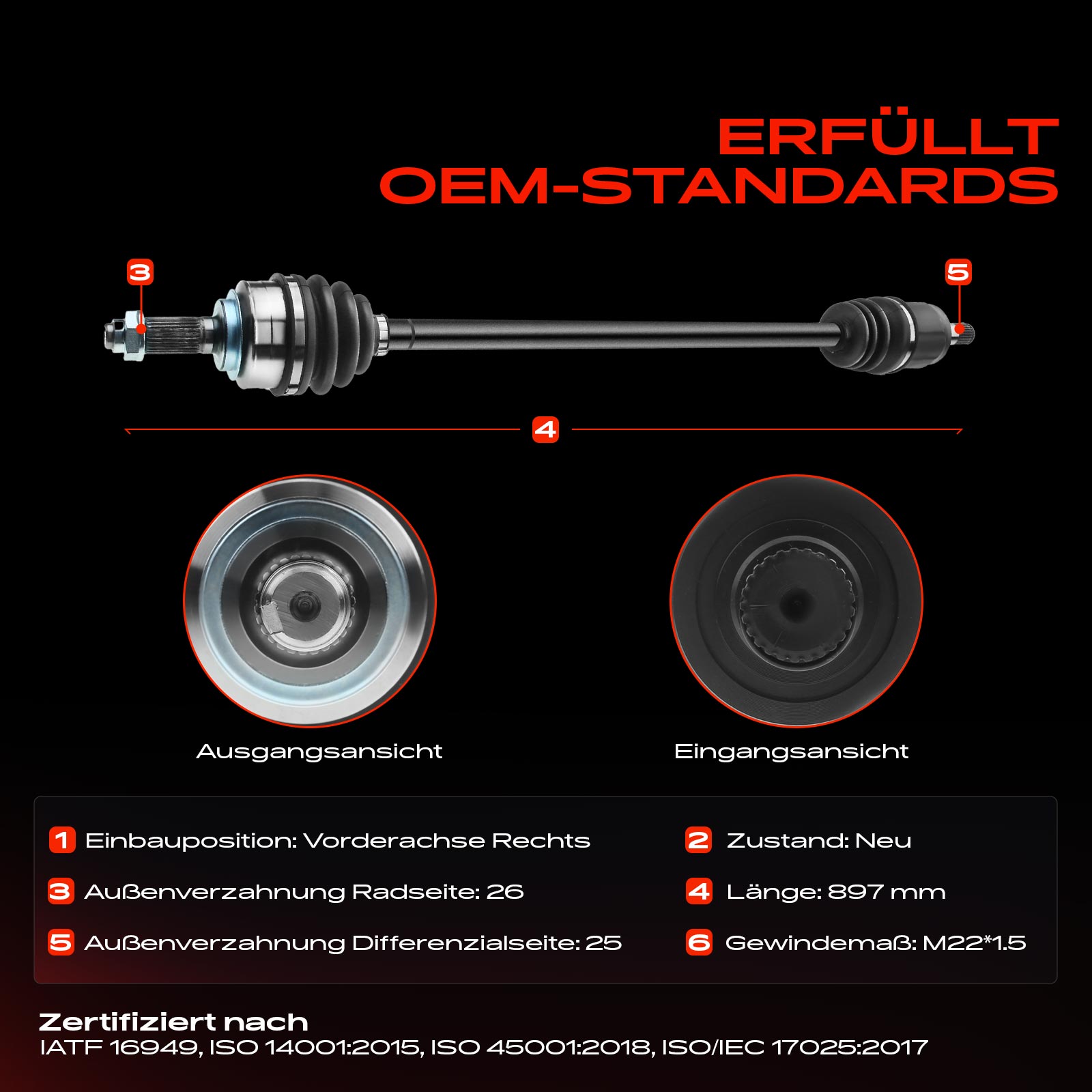 външни зъби от страна на колелото: 26външни зъби откъм диференциал: 25диаметър на шарнира от страна на колелото: 81mmдиаметър на шарнира от страна на скоростната кутия: 75mmдоп. артикул/доп. инфо. 2: с гайкамин. дължина: 897mmмярка на резбата: M22 x 1,5страна на монтаж: на предната ос отдясно