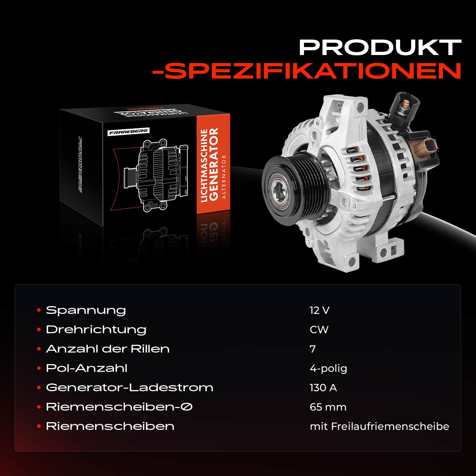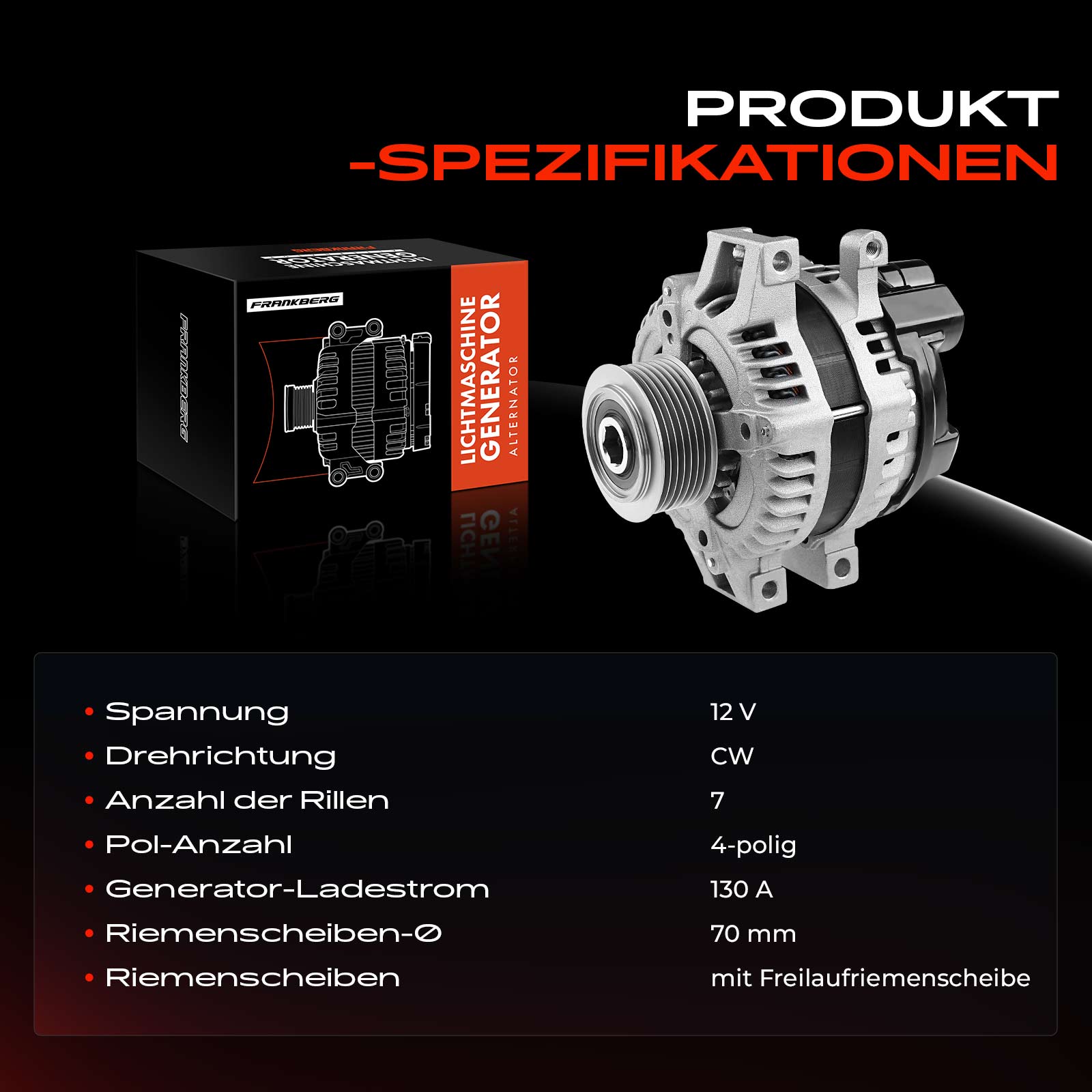 Брой ремъци: 7напрежение: 12волтзаряден ток на генератор: 130Аремъчни шайби: с ремъчна шайба със свободен ходРемъчна шайба Ø: 70mm