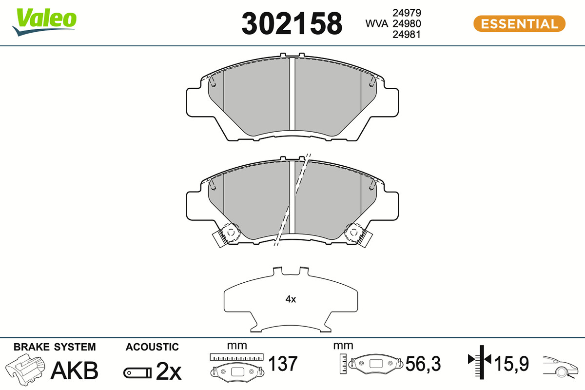 страна на монтаж: предна осWVA-номер: 24979WVA-номер: 24980WVA-номер: 24981брой на покритията: 4височина: 54,8mmдебелина: 16,3mmдължина: 136,5mmконтактен датчик за износване: с акустично предупреждение за износванеспирачна накладка: със скосен кантспирачна система: Akebono