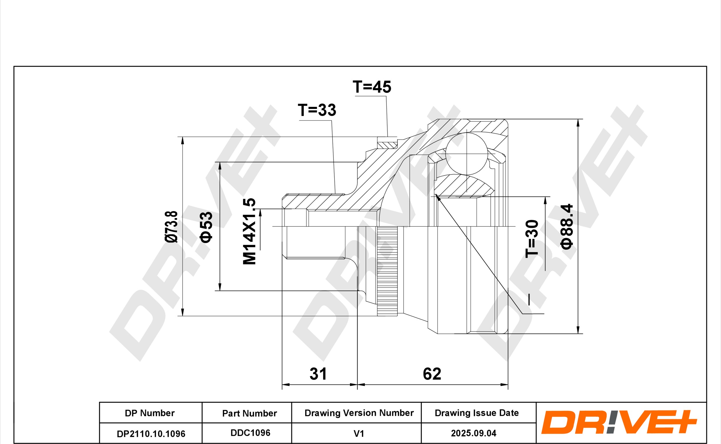 брой на зъбите на ABS-пръстен: 45вид на шарнира: сферично каре (за предаване на постоянно движение)външен диаметър: 88mmвъншни зъби от страна на колелото: 33вътрешни зъби от страната на колелото: 30диам. на гарн.: 53mmстрана на монтаж: от страната на колелото