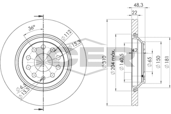 за PR-номер: 1KJза PR-номер: 1KYза PR-номер: 1KZза PR-номер: 2ERза PR-номер: 2ETстрана на монтаж: задна осброй на дупките: 9вид на спирачния диск: вентилиранвисочина: 48,3mmвъншен диаметър: 310mmдебелина на спирачния диск: 22mmцентриращ диаметър: 65mm