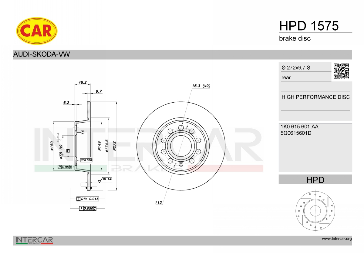 за PR-номер: 1KEза PR-номер: 1KRза PR-номер: 2EGза PR-номер: 2EJстрана на монтаж: задна осджанта: 5-дупкиброй на дупките: 9вид на спирачния диск: плътенвисочина: 48,3mmвъншен диаметър: 272mmдебелина на спирачния диск: 10mmДиаметър на кръговата стъпка Ø: 112mmмин. дебелина: 8mmмярка на резбата: 15,3повърхност: боядисанцвят: черенцентриращ диаметър: 65mm