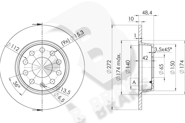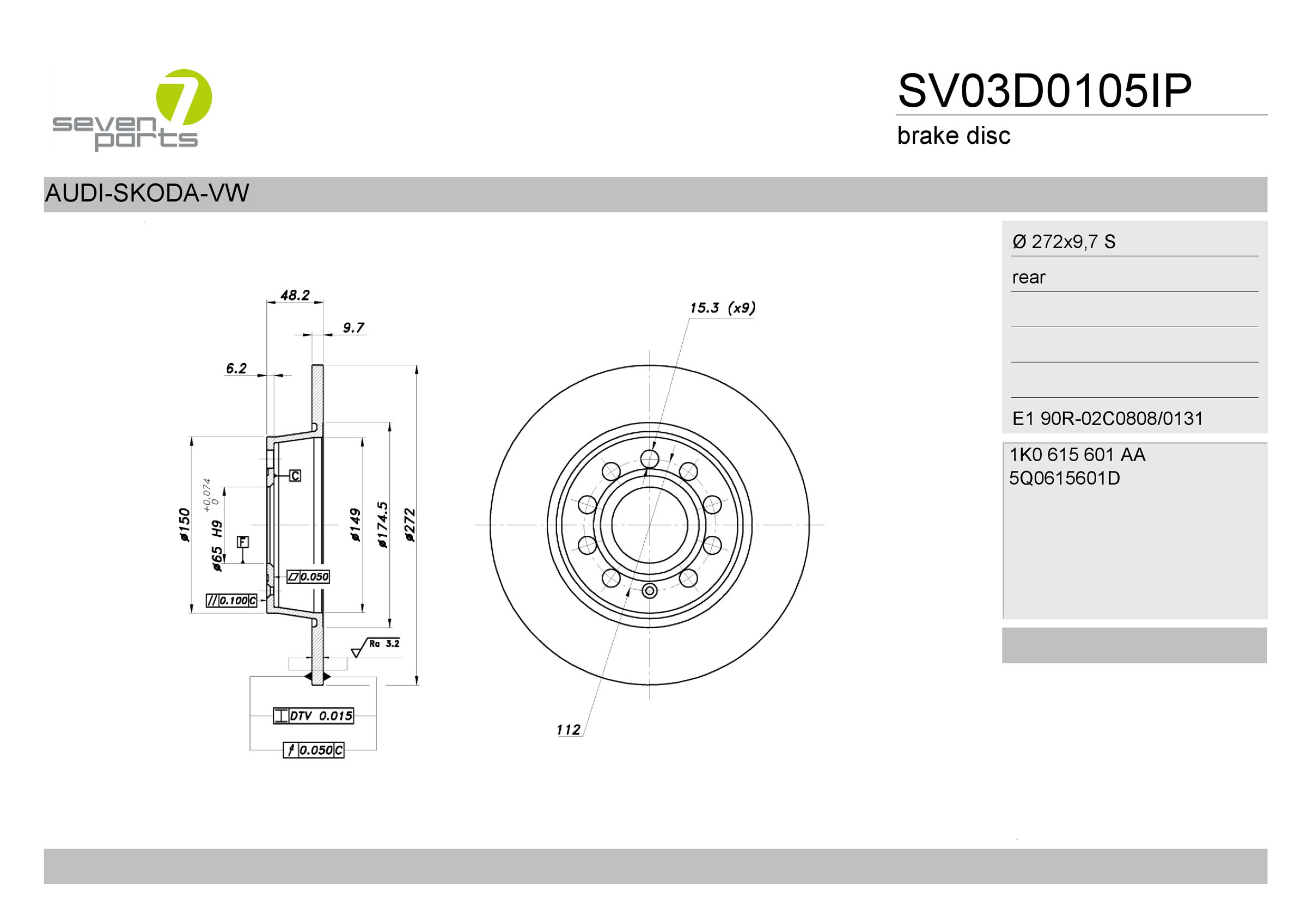 за PR-номер: 1KEстрана на монтаж: задна осТип автомобил: A3джанта: 5-дупкивид на спирачния диск: плътенвисочина: 48,3mmвъншен диаметър: 272mmдебелина на спирачния диск: 10mmГлавина Ø: 150mmДиаметър на кръговата стъпка Ø: 112mmмин. дебелина: 8mmповърхност: с покритиецентриращ диаметър: 65mm