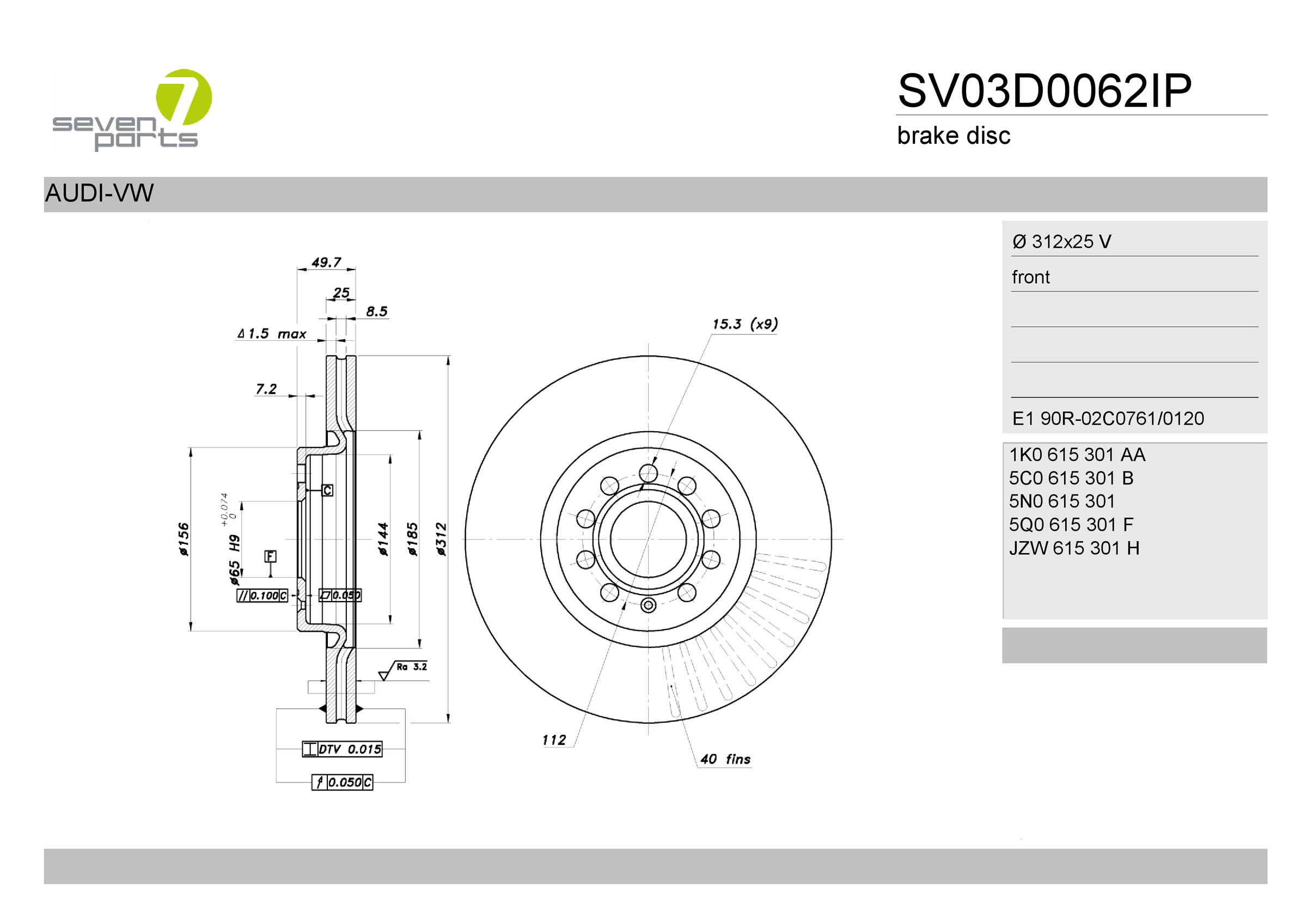 за PR-номер: 1ZAстрана на монтаж: предна осТип автомобил: A3джанта: 5-дупкивид на спирачния диск: вентилиранвисочина: 49,5mmвъншен диаметър: 312mmдебелина на спирачния диск: 25mmГлавина Ø: 156mmДиаметър на кръговата стъпка Ø: 112mmмин. дебелина: 22mmповърхност: с покритиецентриращ диаметър: 65mm
