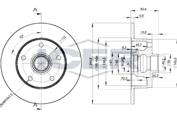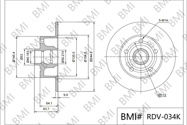 брой на дупките: 5вид на спирачния диск: плътенвисочина: 84mmвъншен диаметър: 245mmдебелина на спирачния диск: 10mmДиаметър на кръговата стъпка Ø: 112mmмин. дебелина: 8mmмярка на резбата: M14X1.5повърхност: с покритиестрана на монтаж: задна осцентриращ диаметър: 45,2mm