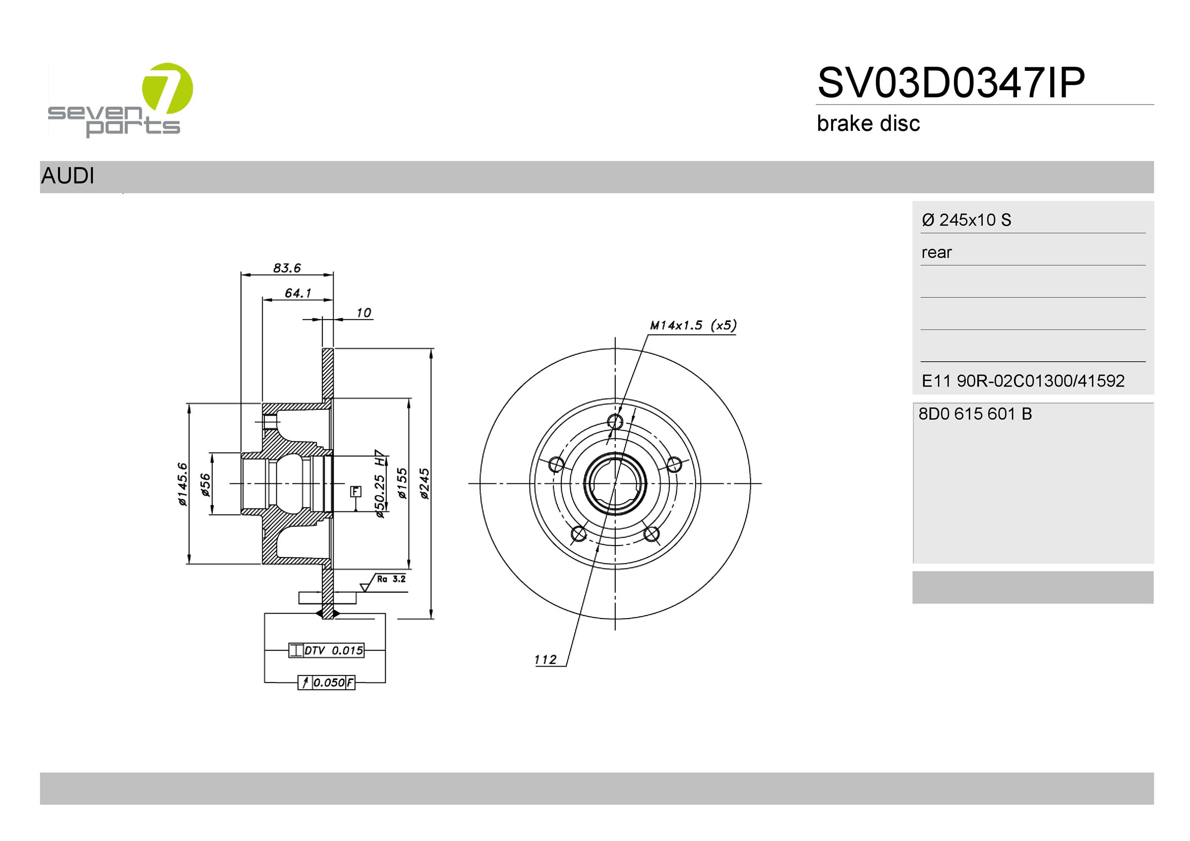 страна на монтаж: задна освид на спирачния диск: плътенвисочина: 83,6mmвъншен диаметър: 245mmдебелина на спирачния диск: 10,0mmза OE-номер: 8D0615601Bмин. дебелина: 8,0mmповърхност: боядисан