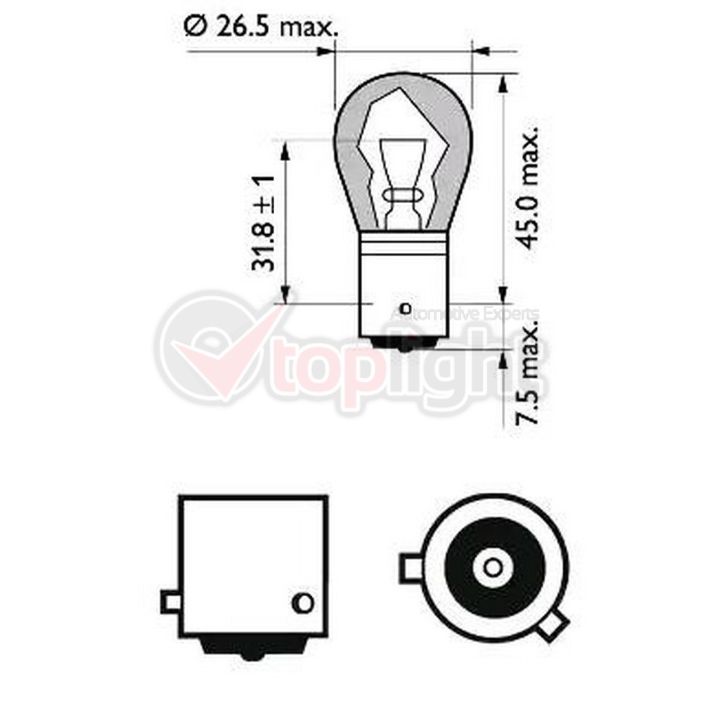 височина: 52,5mmØ: 26,5mmнапрежение: 12волтИзпълнение на цокъла крушка: BAY15dноминална мощност: 21/5Wтип на крушката: P21/5W
