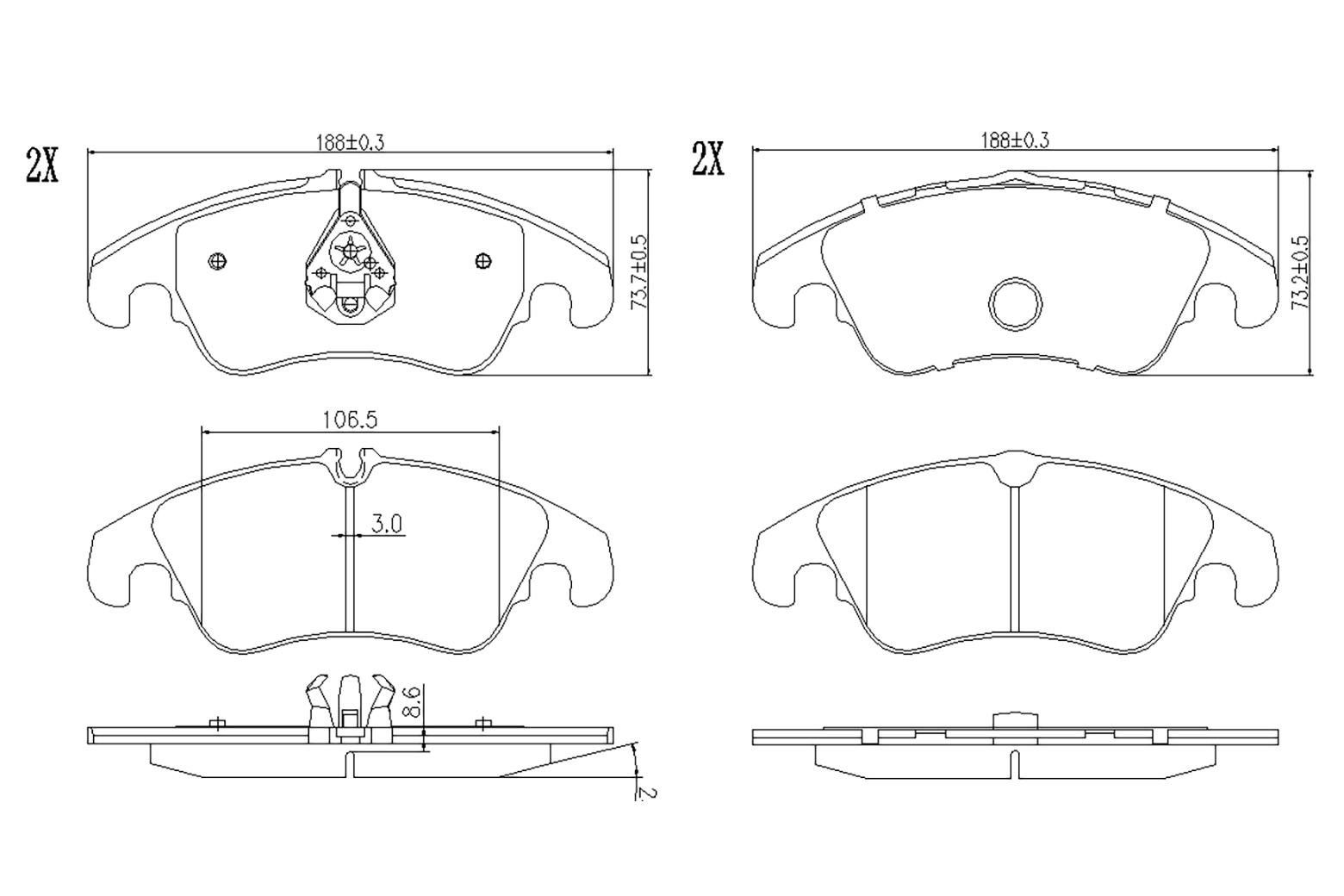 Брой индикатори за износване: 2за освисочина 1: 73,1mmвисочина 2: 73,6mmдебелина: 19mmза OE-номер: 4G0 698 151 AAконтактен датчик за износване: подготвен за предупредителен датчик за износванеограничение за производител: TRWстрана на монтаж: предна осширина: 188mm